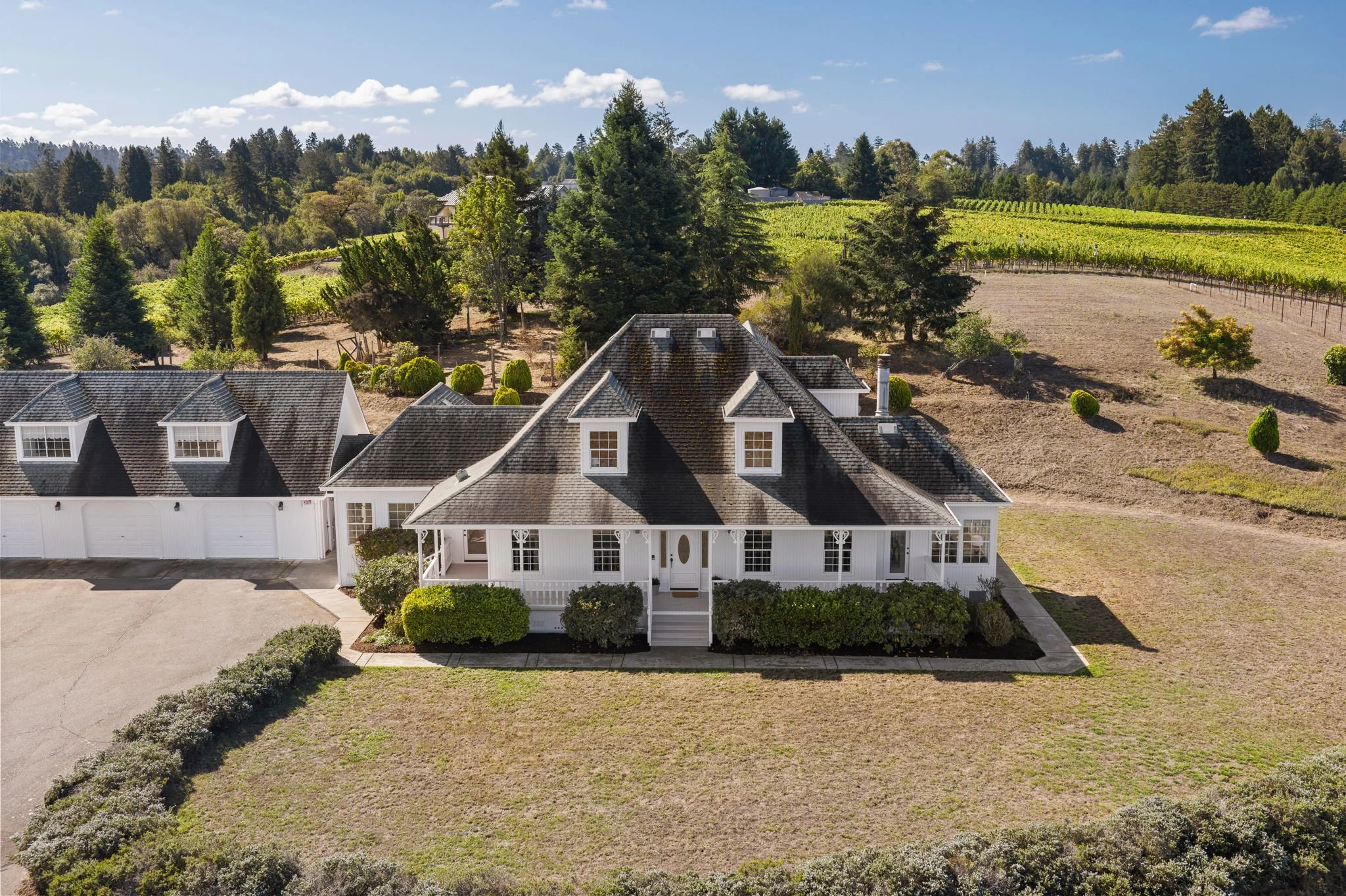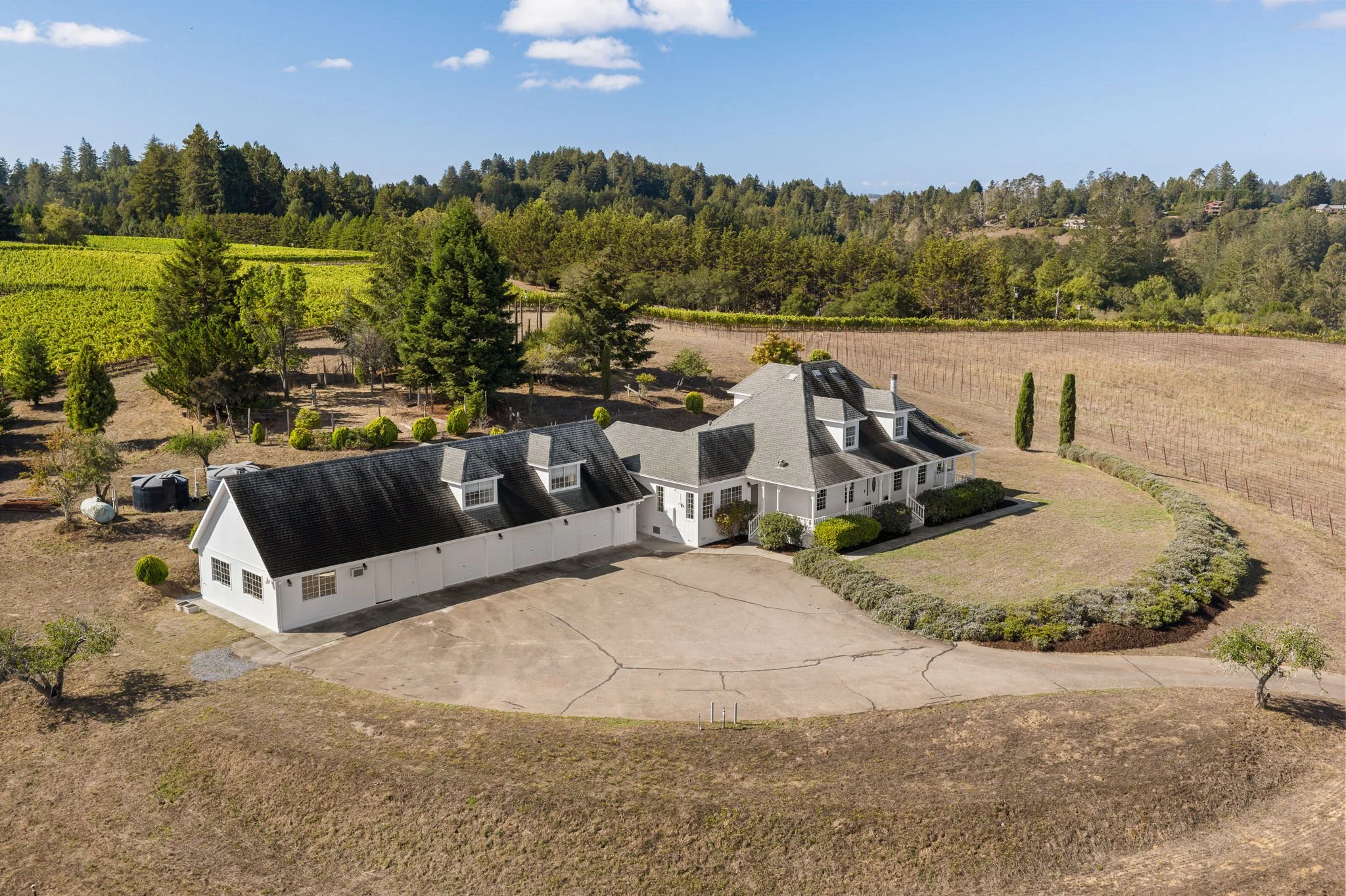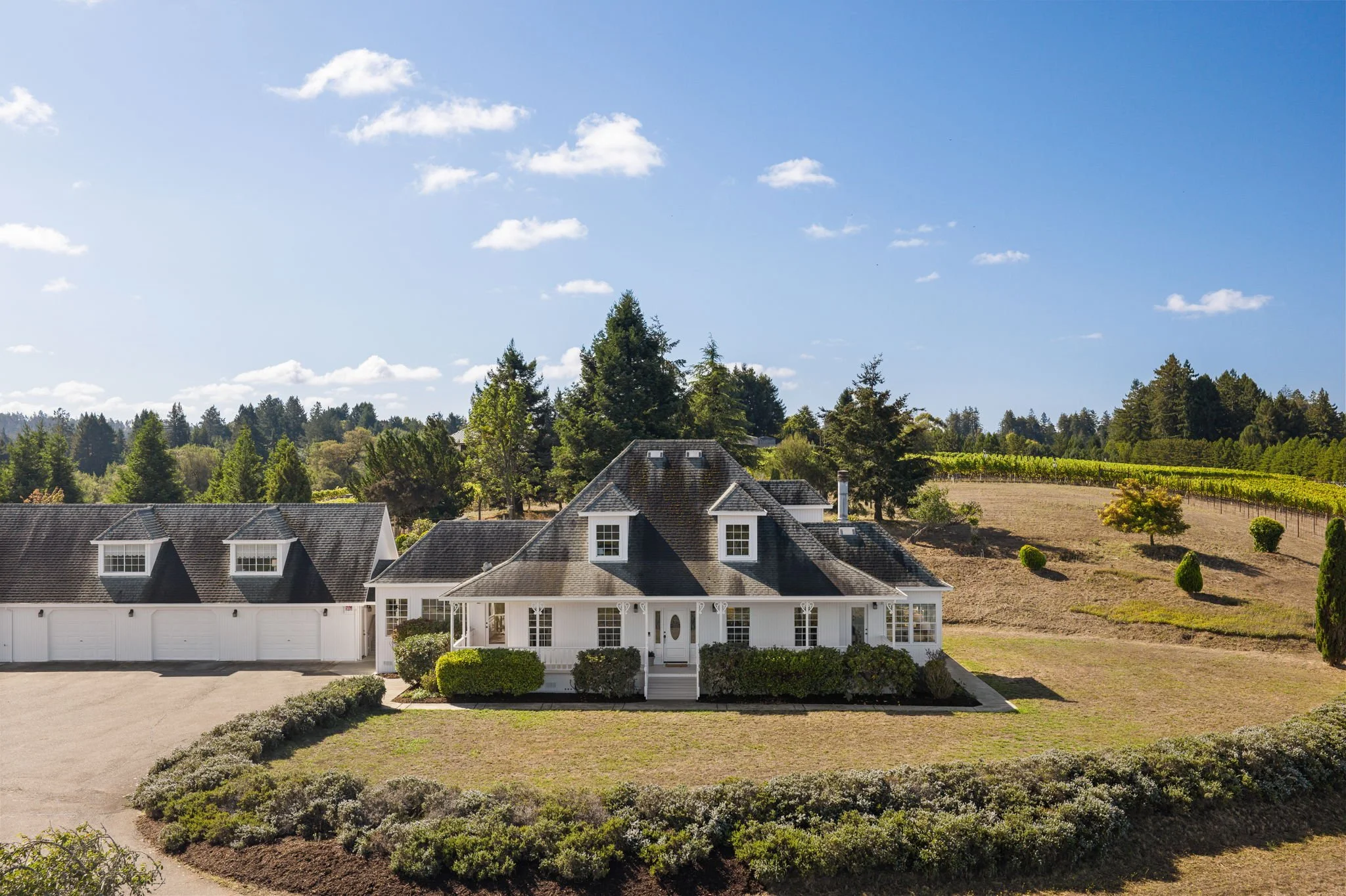 Aerial view of a large white house with a dark roof, surrounded by a lawn and landscaping, with a wooded area and vineyard in the background under a blue sky with clouds.
