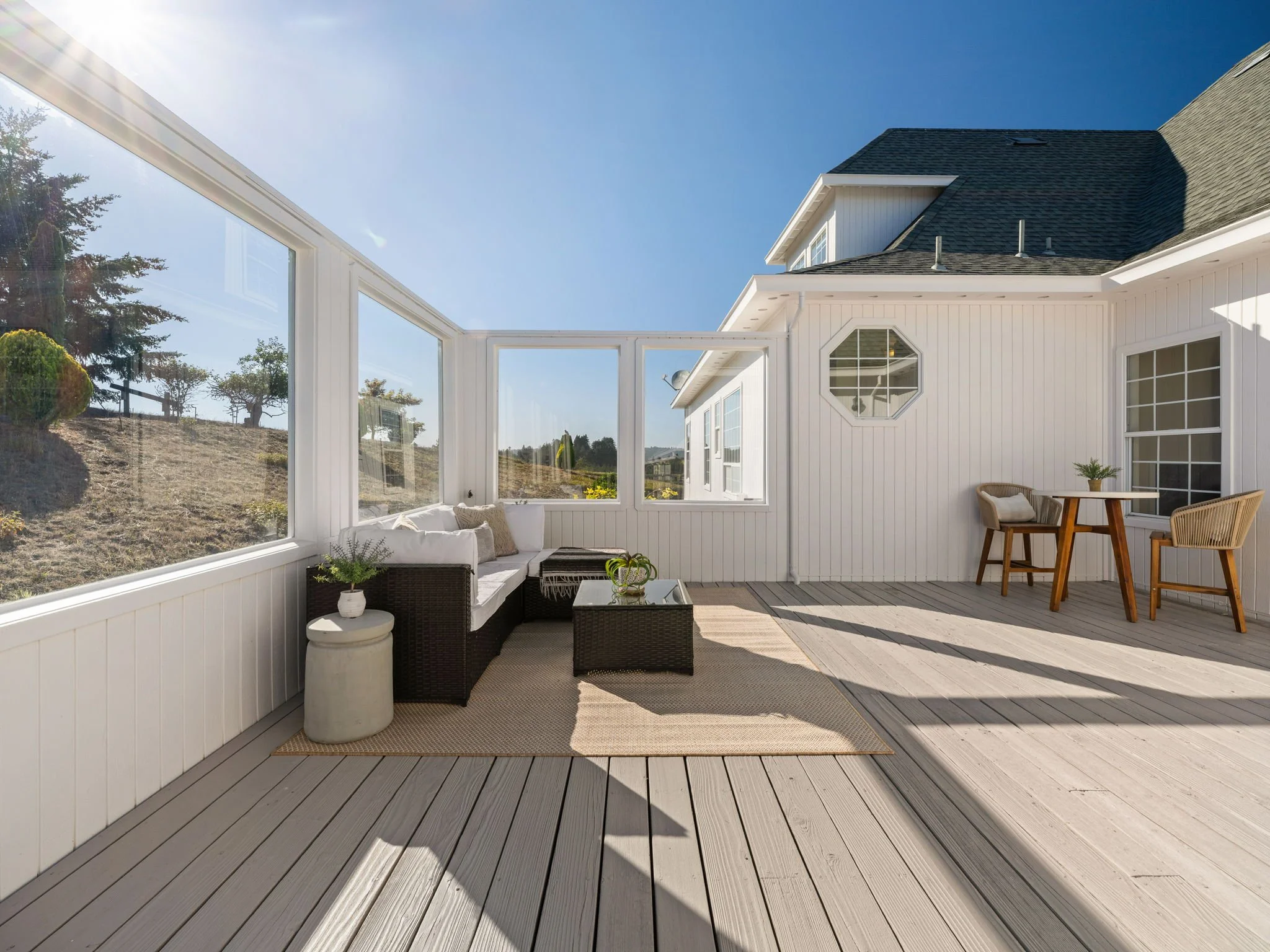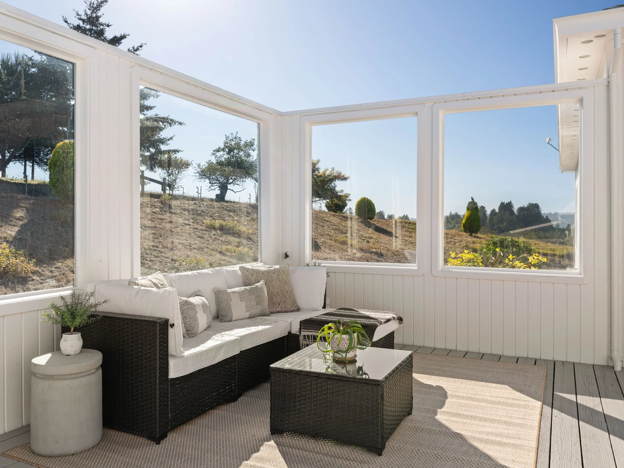 Enclosed porch with white wooden walls and large windows, outdoor furniture including a sectional sofa with cushions, a coffee table, potted plants, and a beige rug. Trees and a hillside are visible outside.