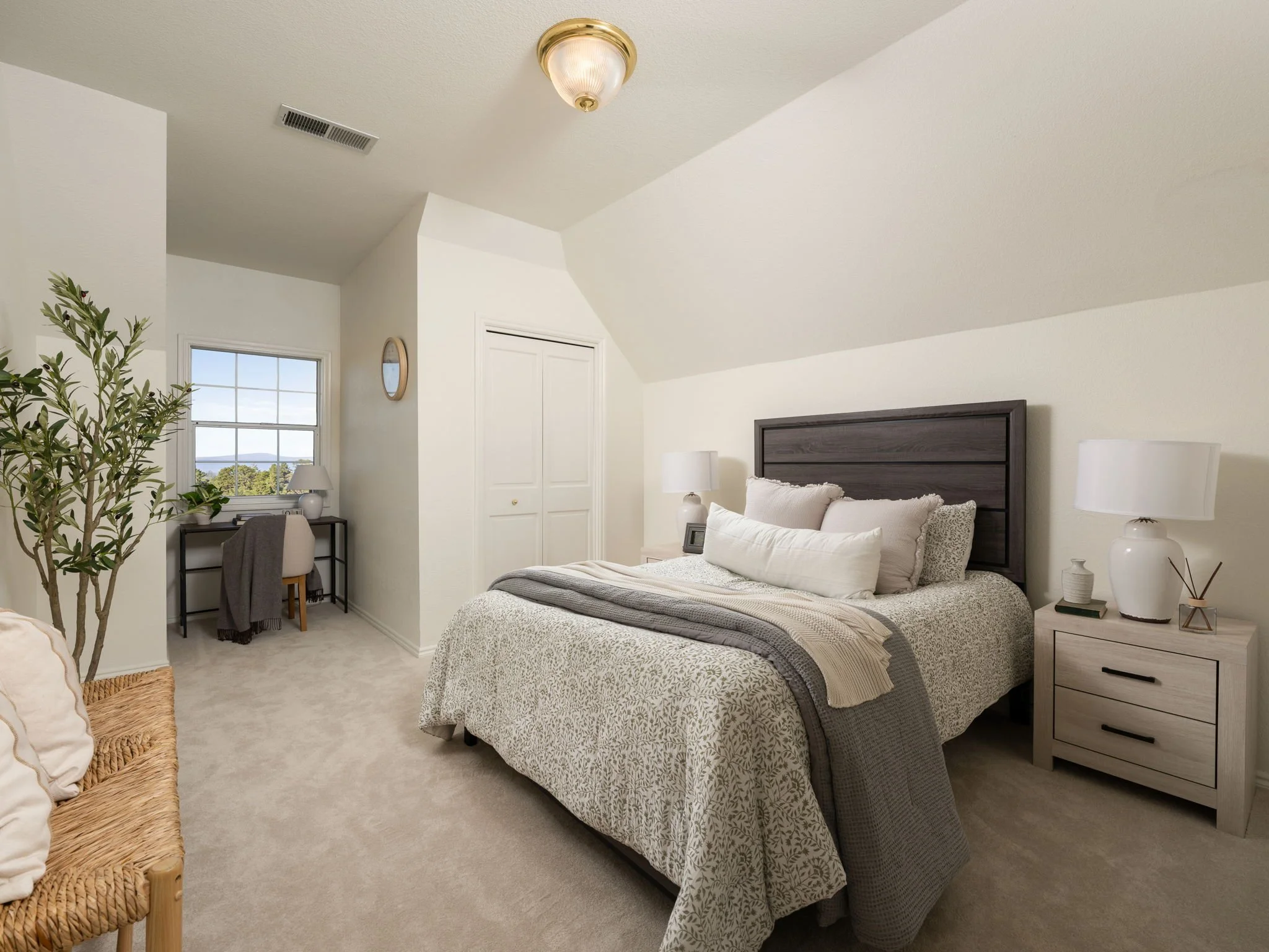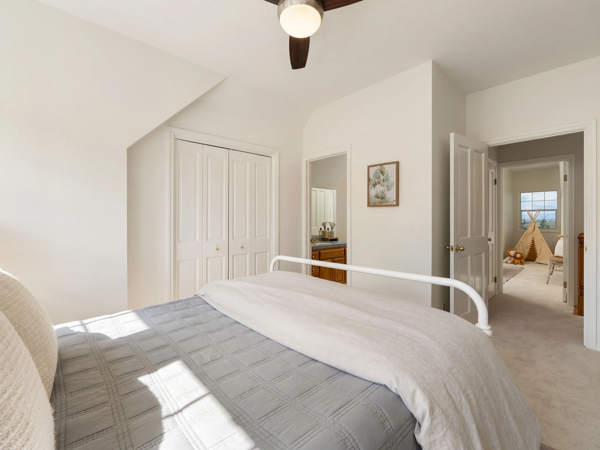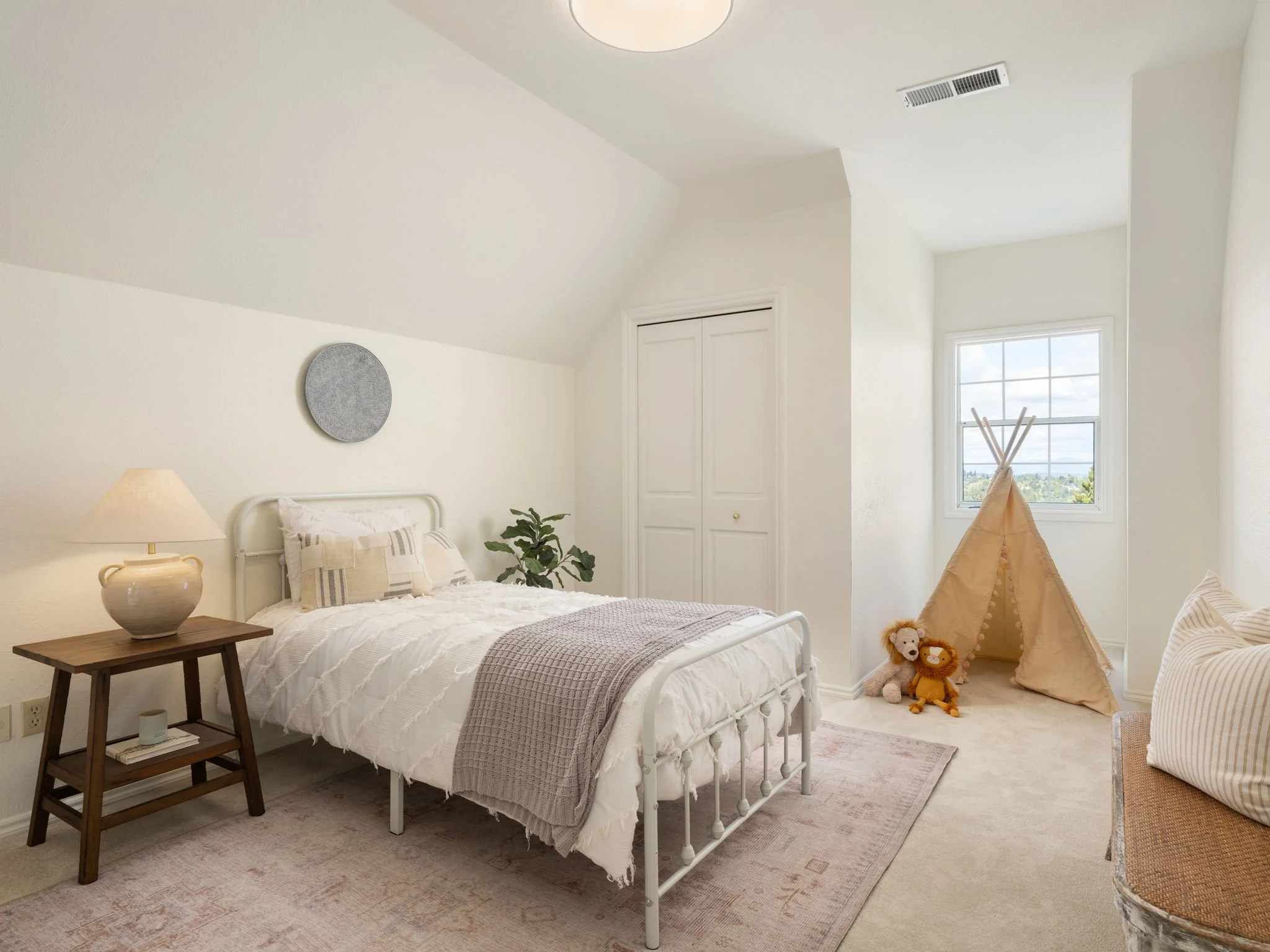 Bedroom with white walls, a bed with light-colored bedding, closet with double doors, a small bathroom vanity with a mirror, and a children's play area with a teepee tent and toys in the background.