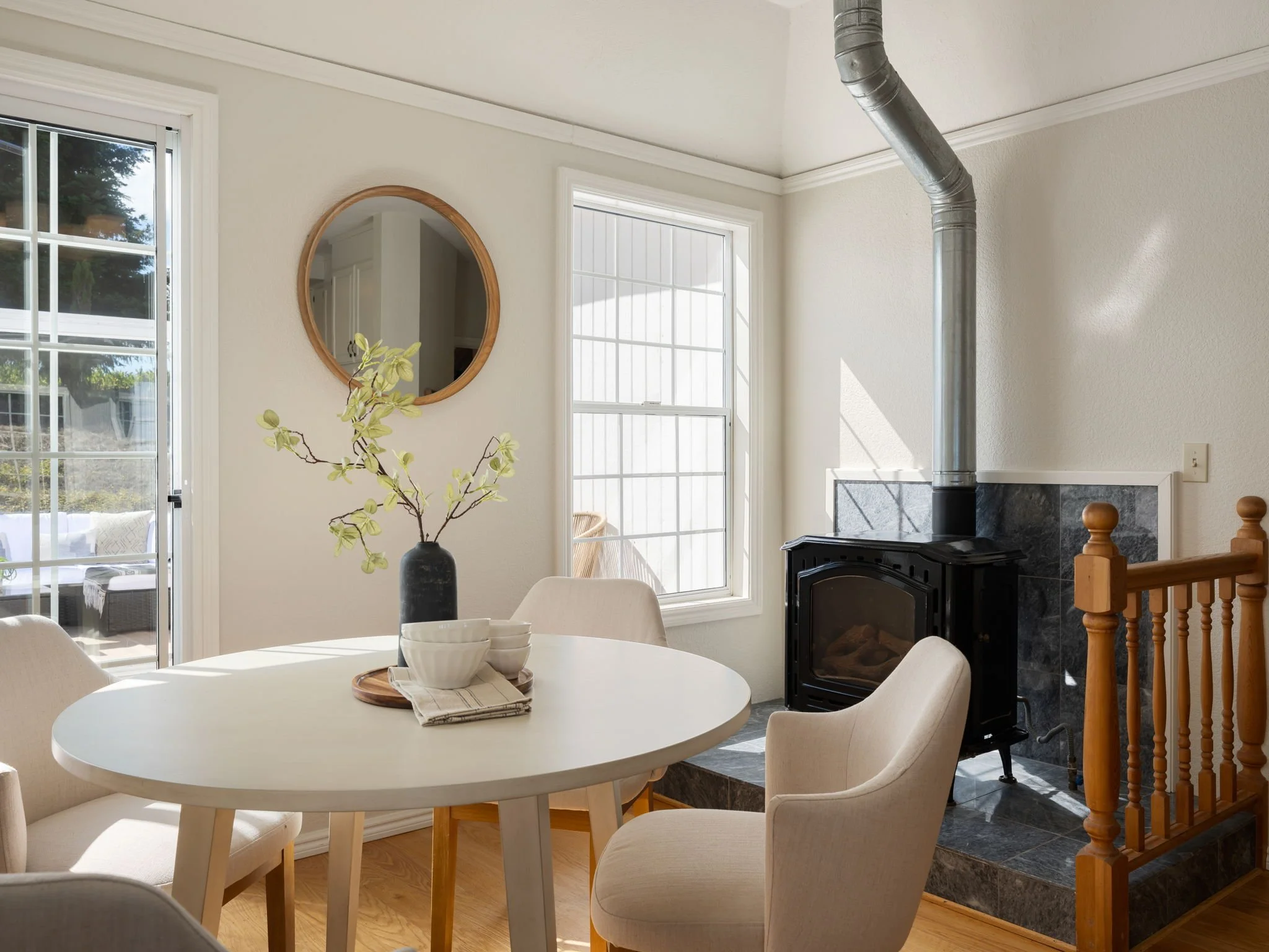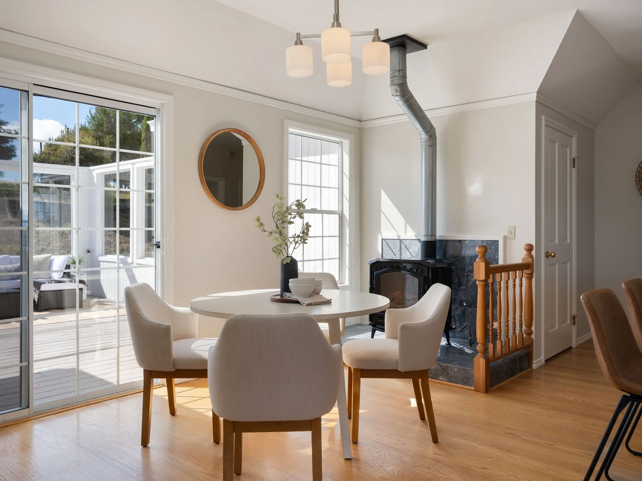 Bright dining area with a round white table, four white upholstered chairs, a vase with greenery, and a wood stove with a chimney pipe. Large sliding glass door leading to a patio with outdoor seating and a screened porch visible outside.