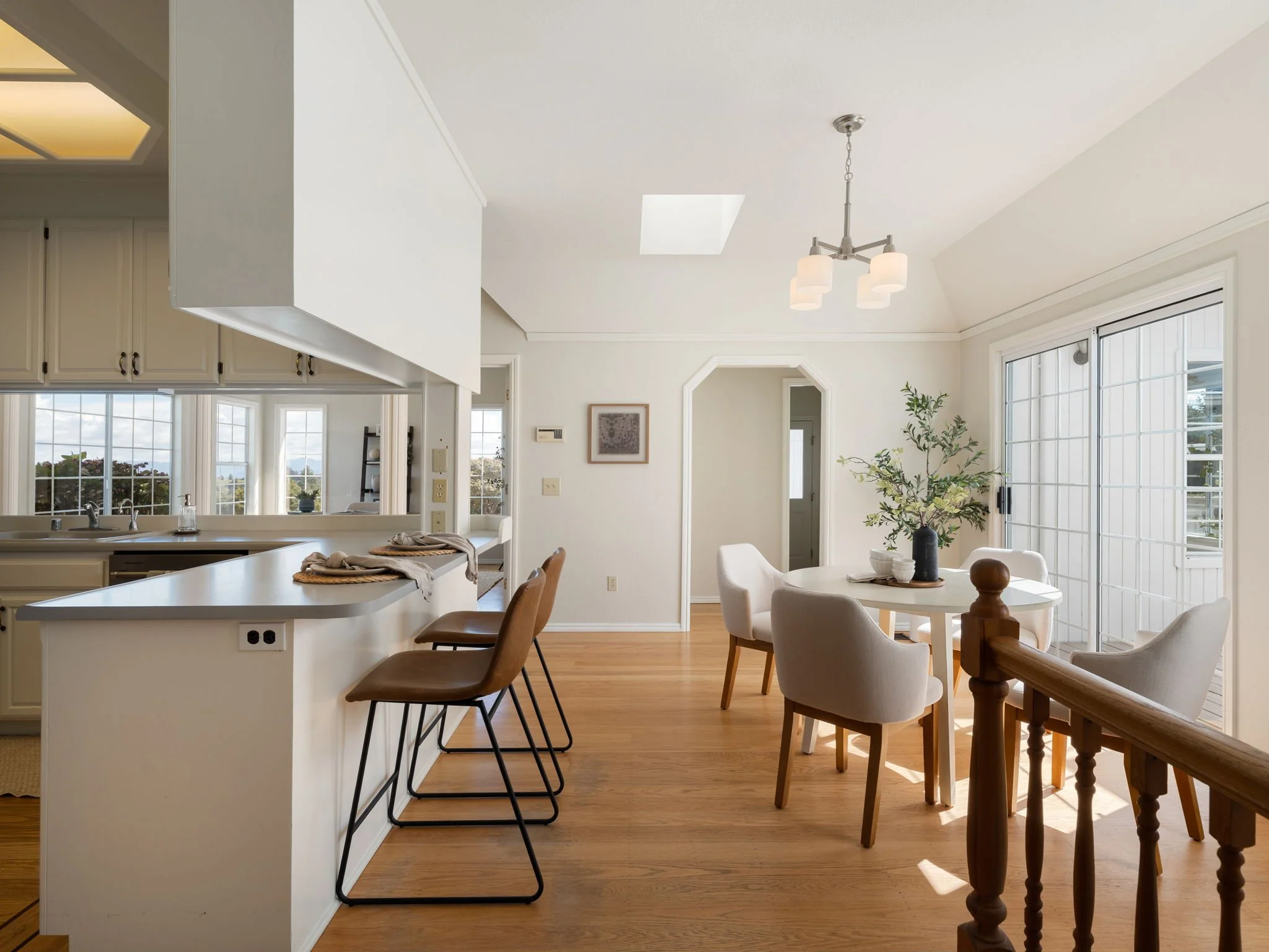 Bright dining area with a round table, four white upholstered chairs, a vase with greenery, outside view through sliding glass doors, and a kitchen with a breakfast bar and chairs.
