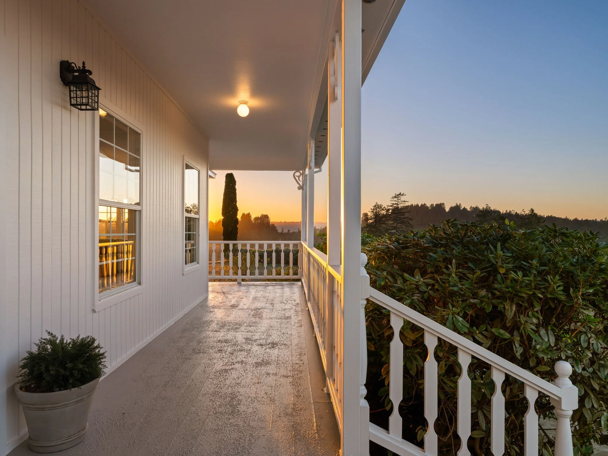 Front porch of a house during sunset with a white railing, a single light on the ceiling, and a scenic view of a tree-covered landscape in the distance.