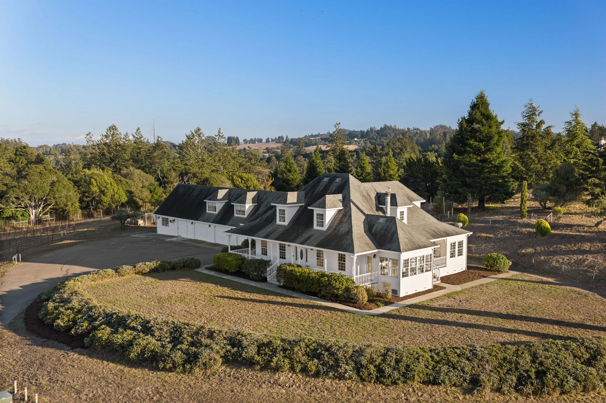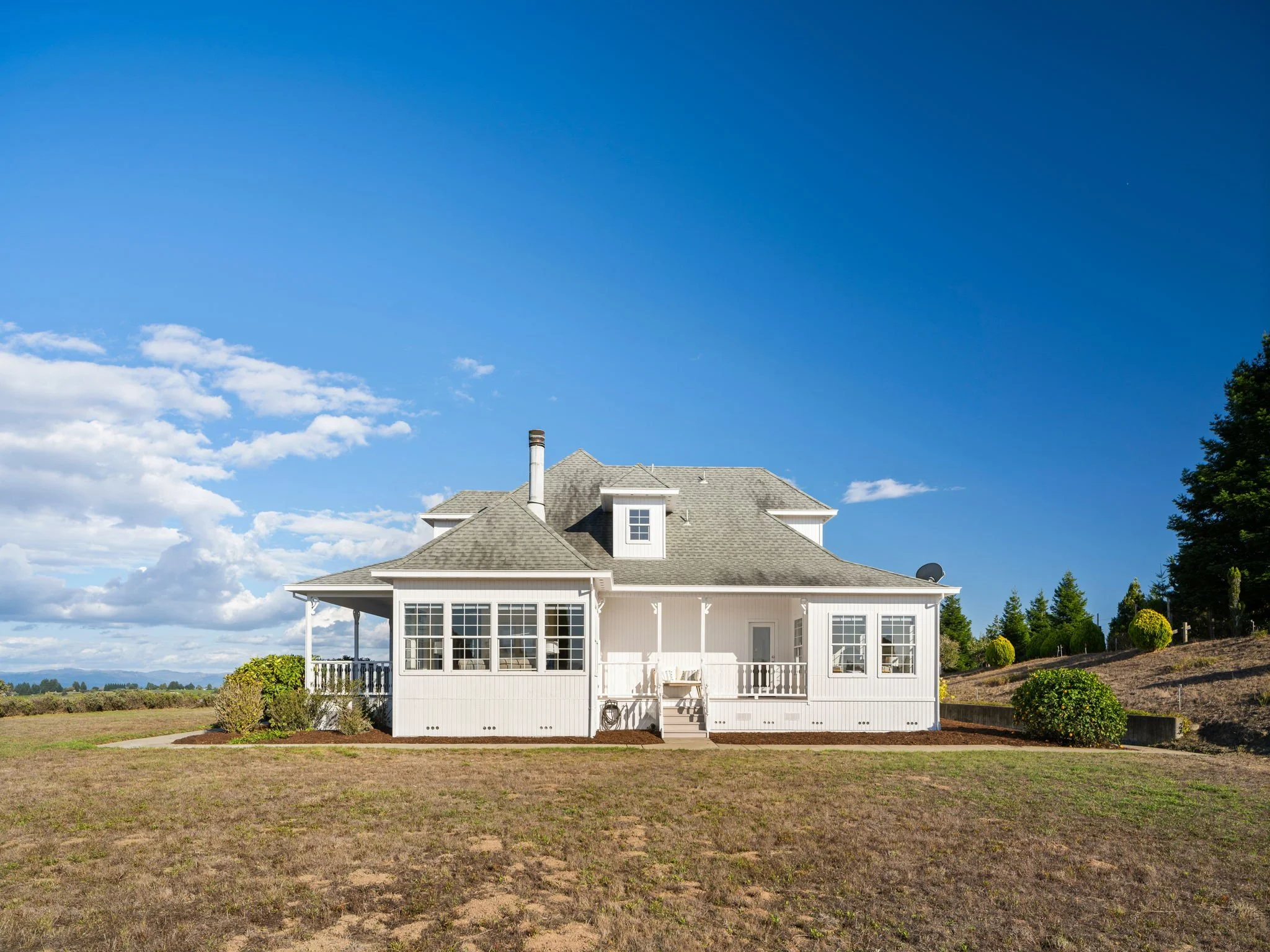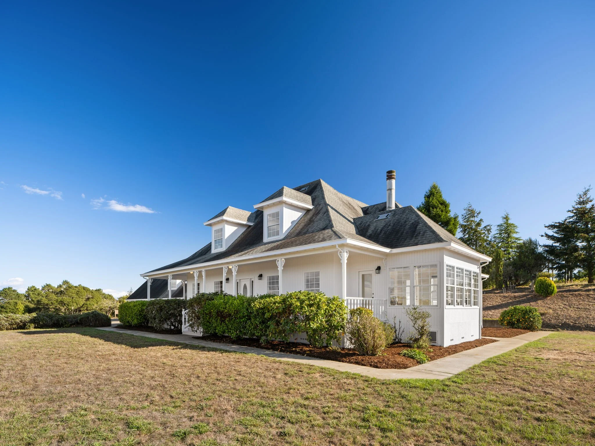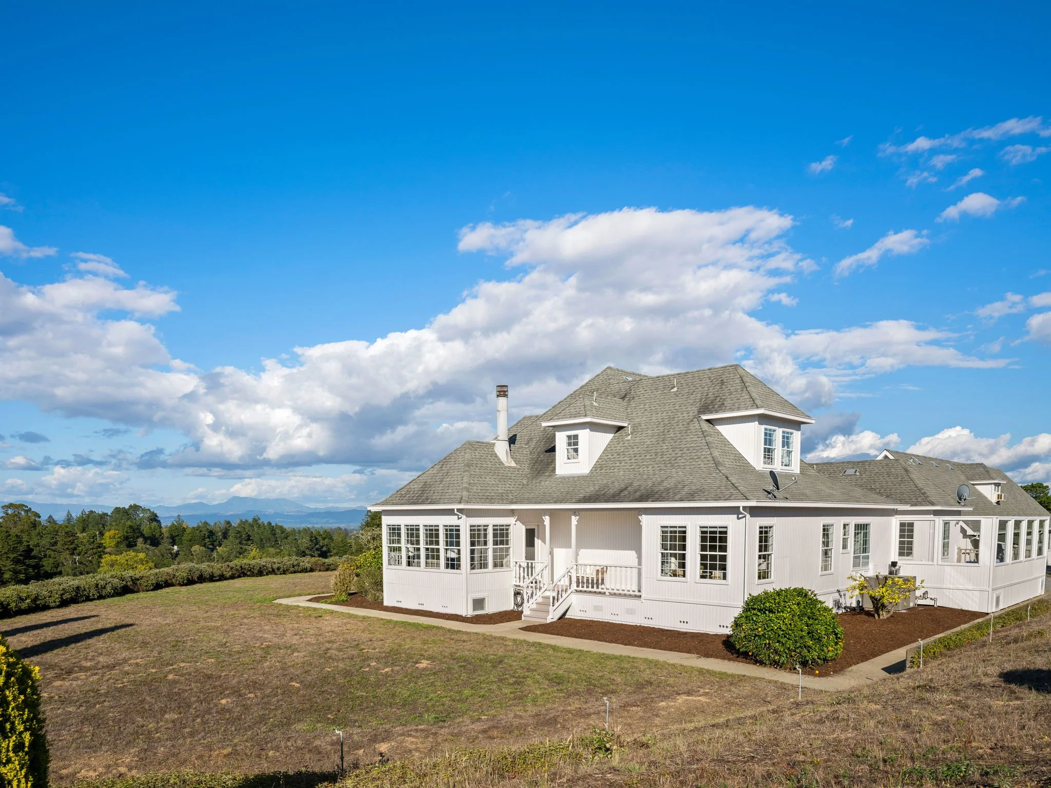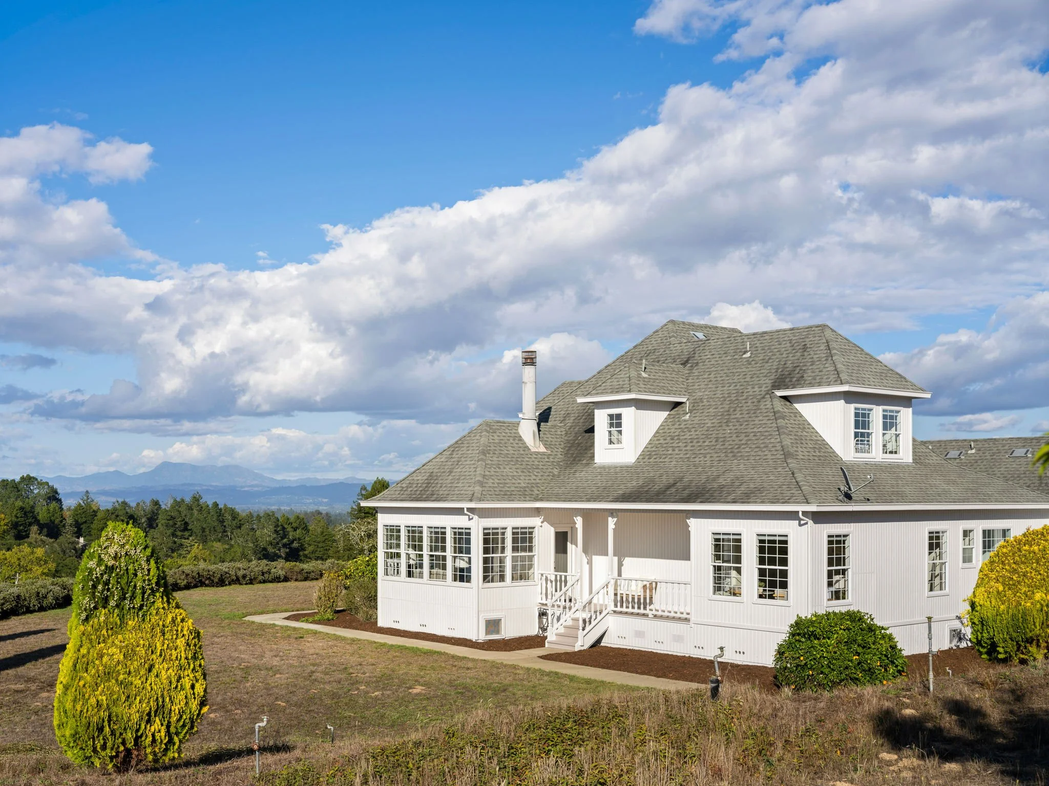 A large white house with a dark roof, front porch, and multiple windows surrounded by a well-maintained lawn and bushes, with a driveway leading up to it. In the background are rolling hills, trees, and a vineyard under a clear sky.