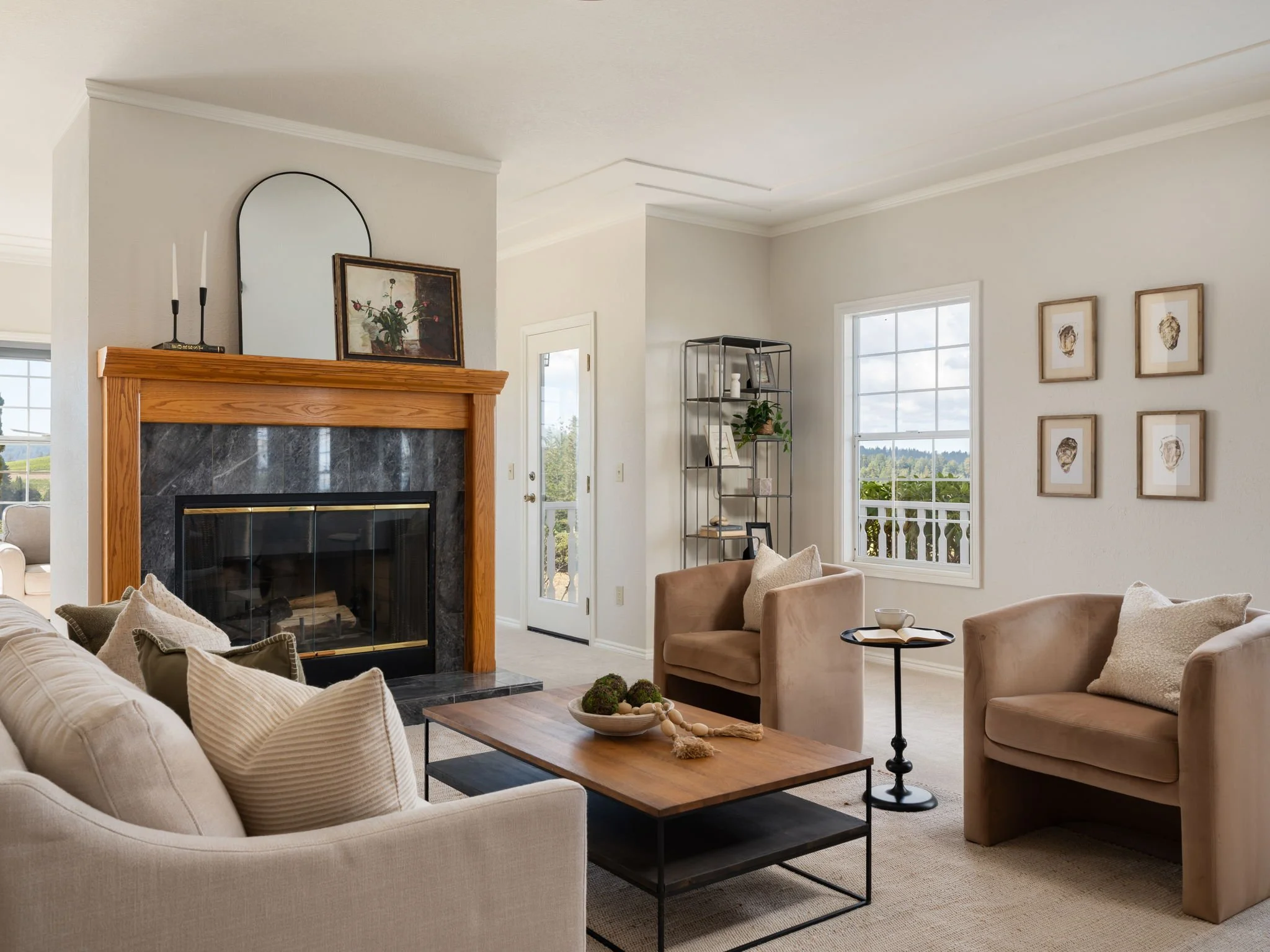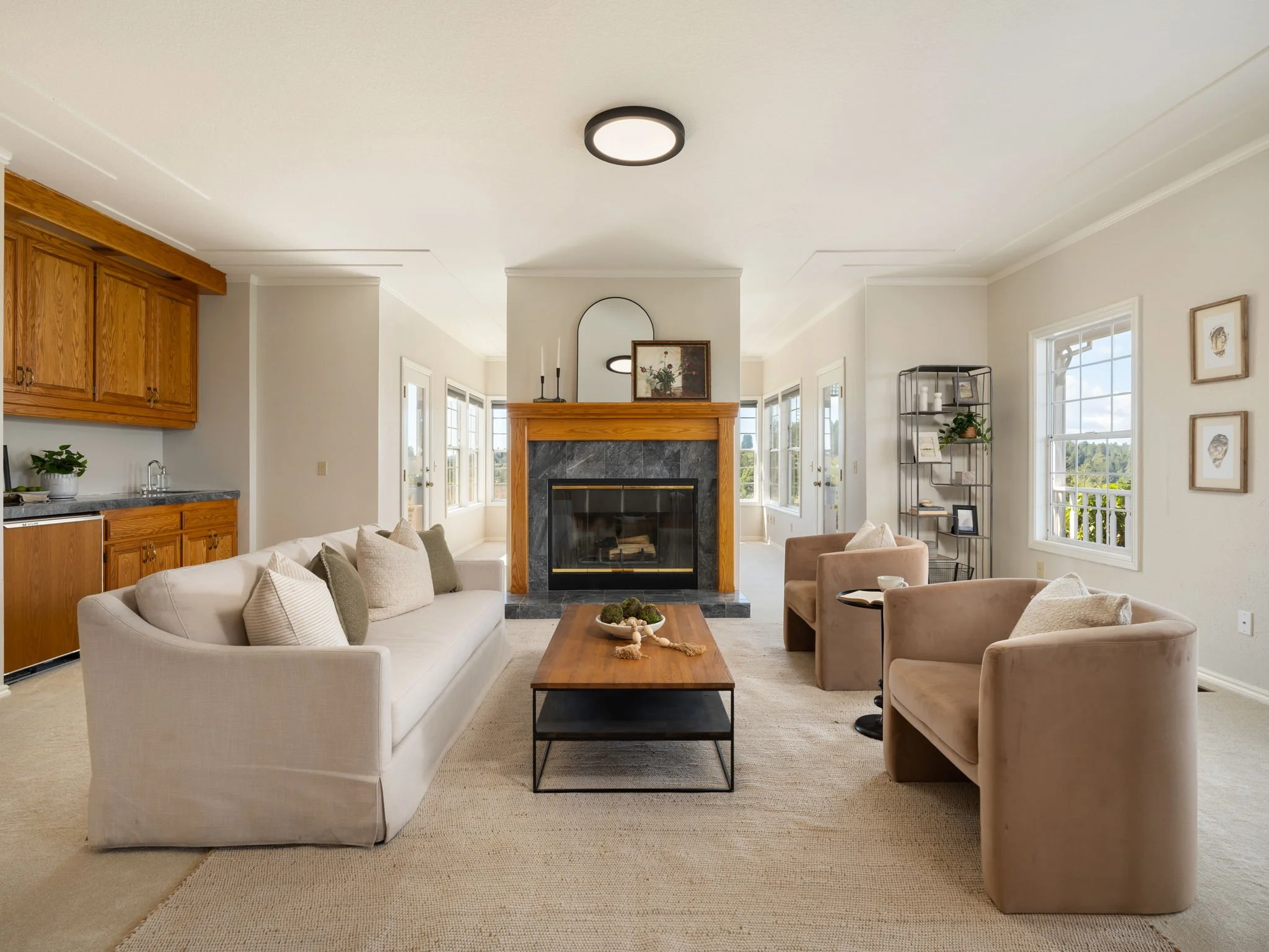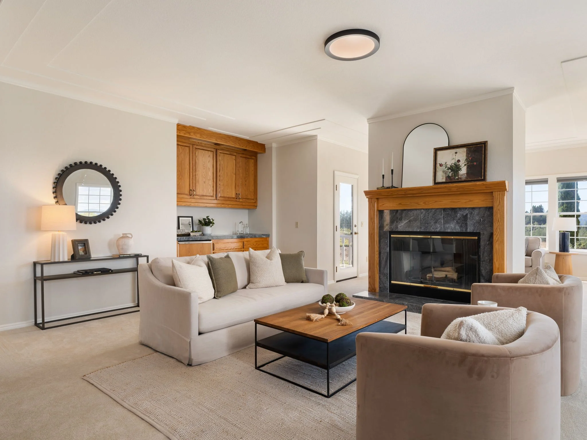 Living room with white sofa, beige armchair, wooden coffee table, fireplace with wooden mantel, and large window with natural light.