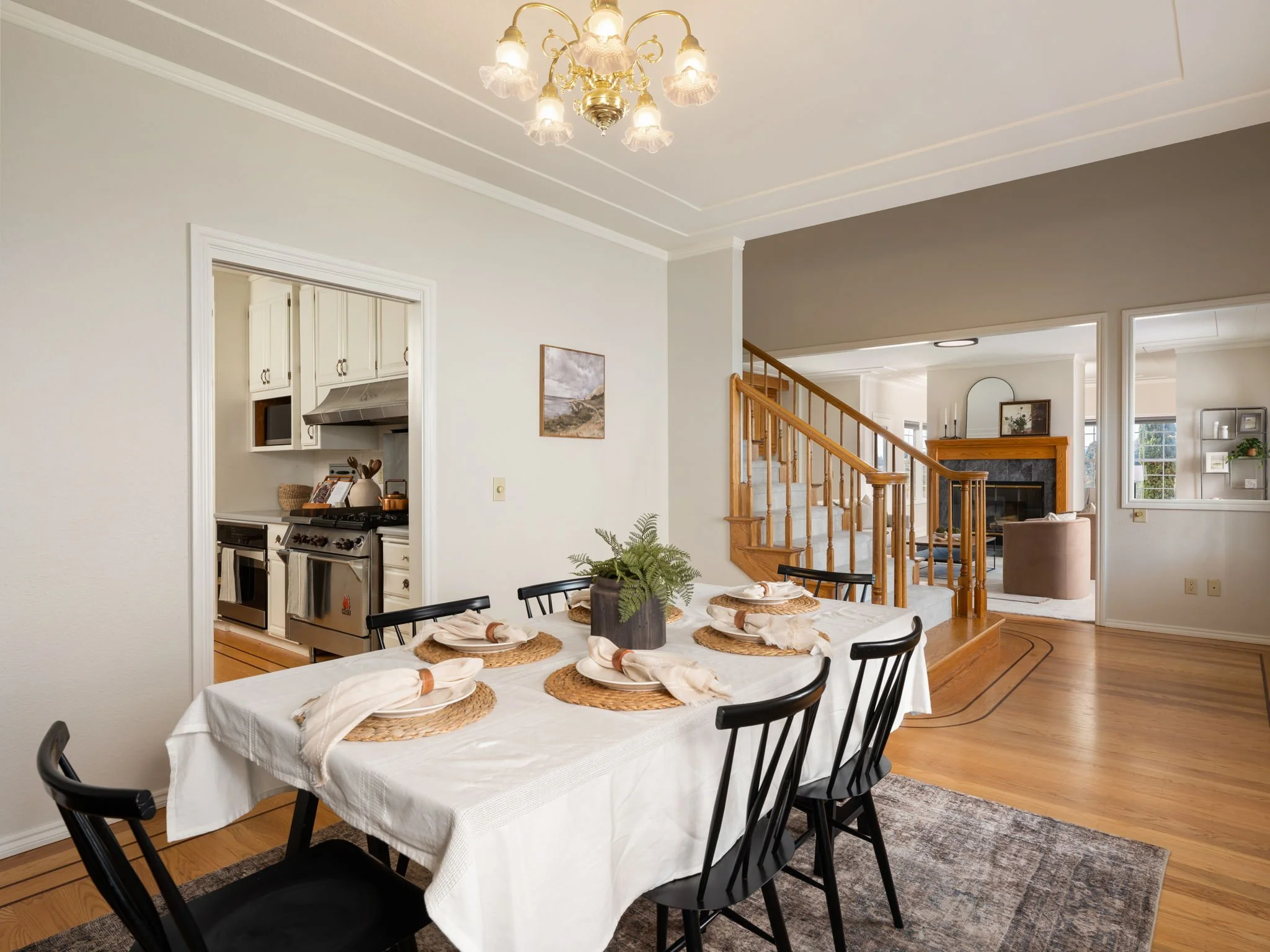 Dining room with white tablecloth, six black chairs, and a centerpiece plant. Visible staircase, living room with fireplace, and kitchen in the background, with hardwood flooring.
