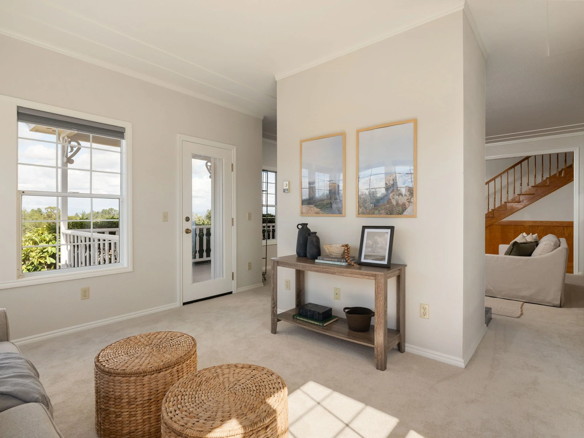 Living room with large window, door leading to balcony, woven ottomans, and a console table with decorations, couch, and staircase in the background.