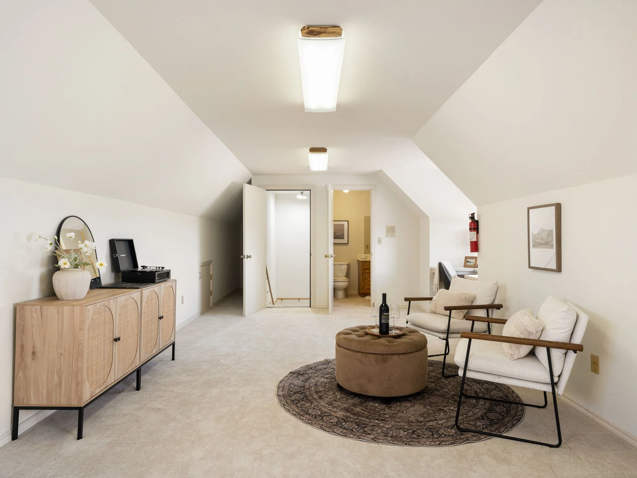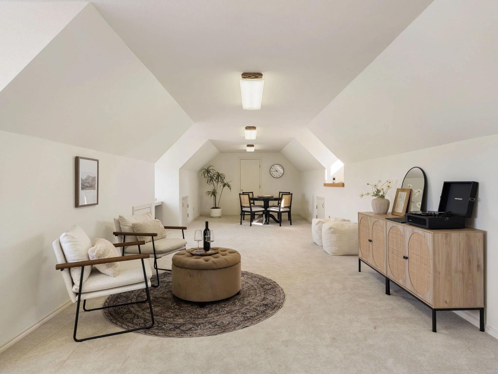 An attic living room with white walls, beige carpet, and a sloped ceiling. It features a round rug with a tufted ottoman, two white chairs with wood arms, a framed picture on the wall, a wooden sideboard with a turntable and a mirror, a table with fo