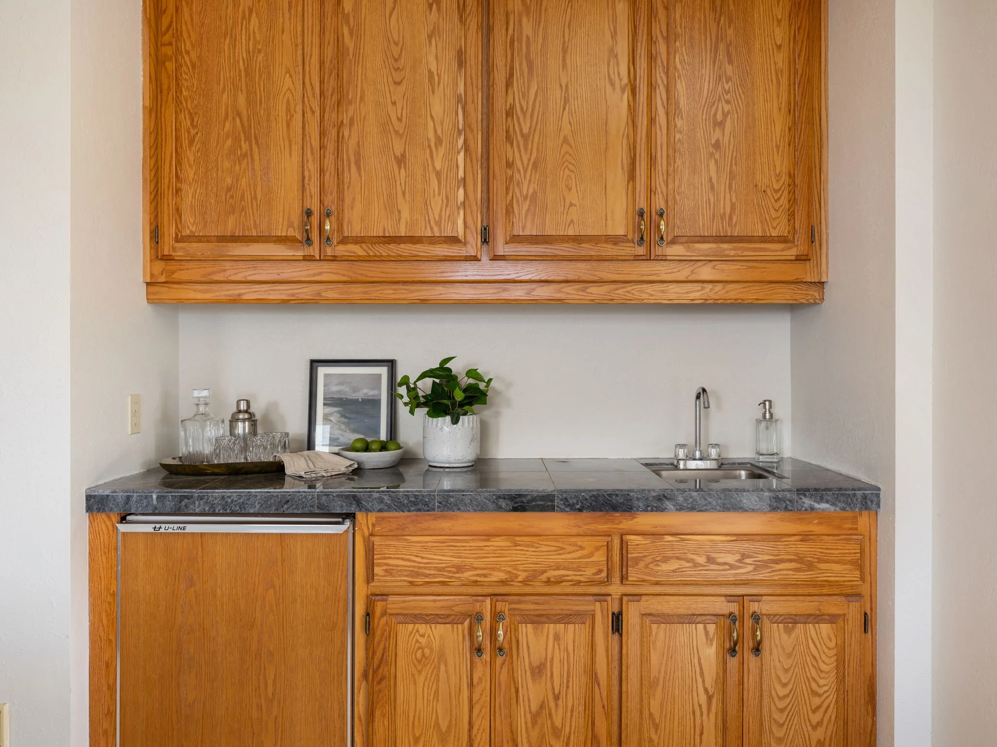 Kitchen with wooden cabinets, a granite countertop, a small sink, a small refrigerator, decorative items including a framed picture, a potted plant, and glassware.