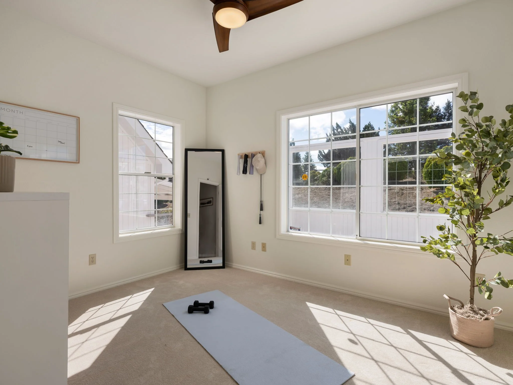 Empty room with large windows, a white yoga mat and dumbbells, a standing mirror, a ceiling fan, a potted plant, and an organizing board on the wall. View fullsize