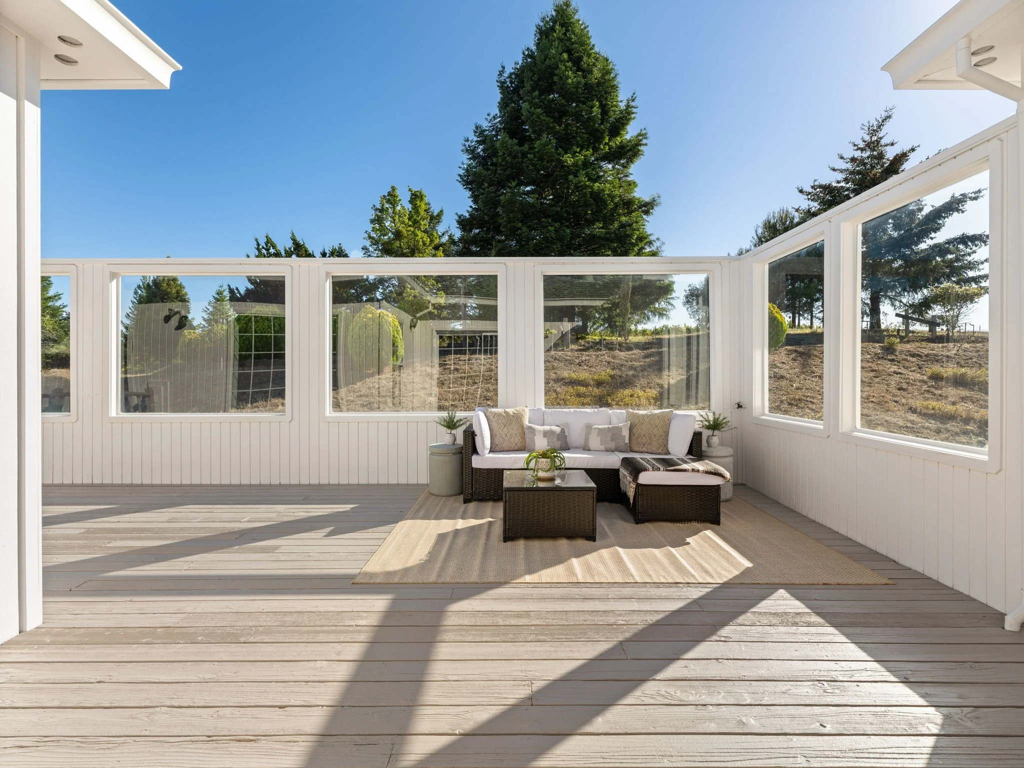 Bright outdoor patio with wooden decking, wicker sofa with cushions, potted plants, small table, and a small table with two chairs, surrounded by white enclosure and overlooking a hillside with trees and clear blue sky.