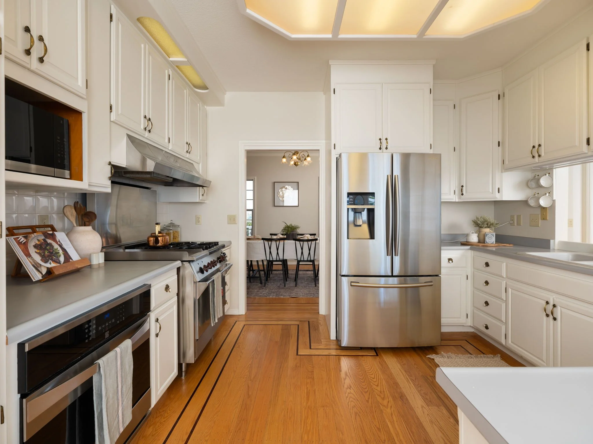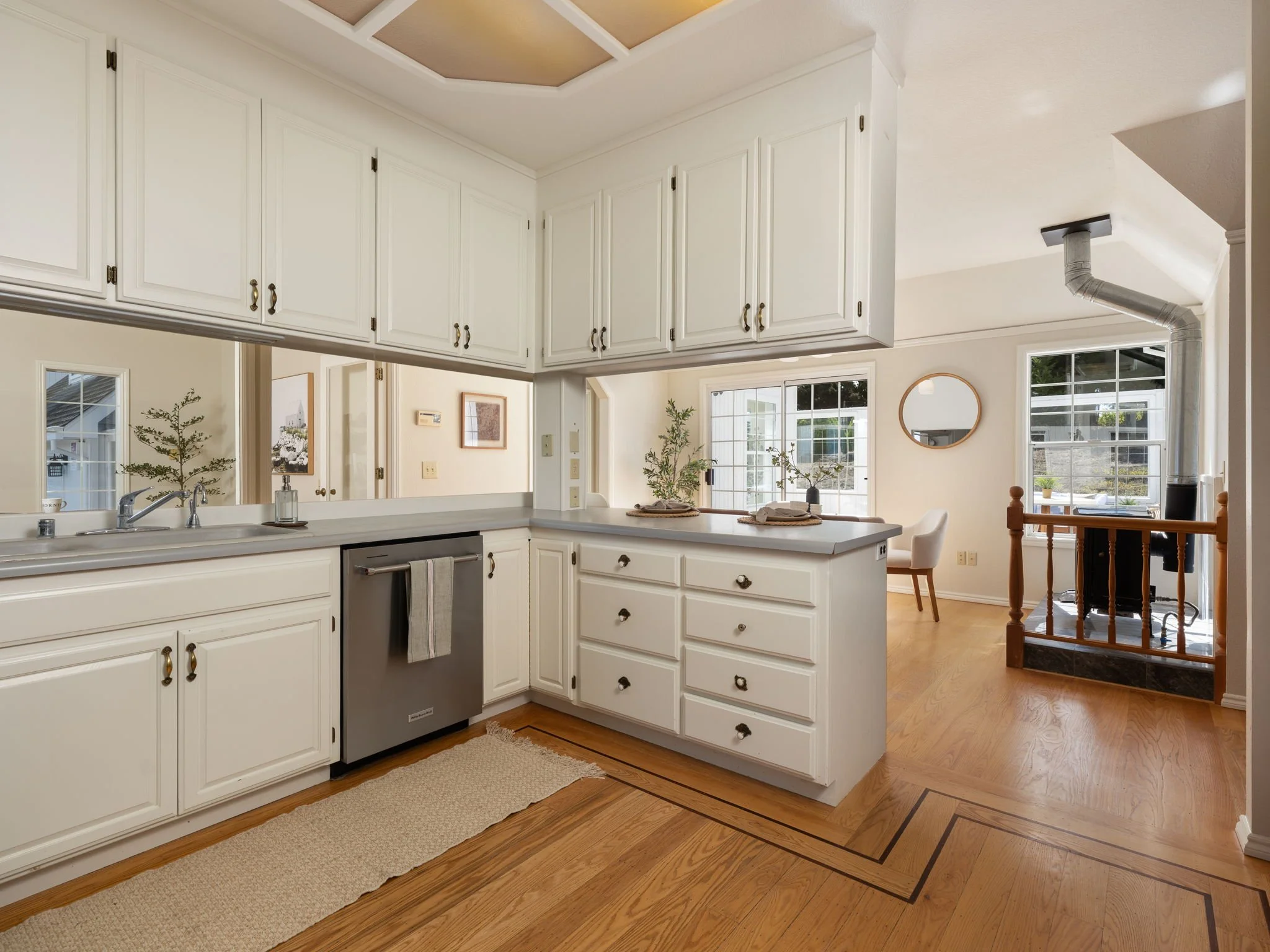 Bright kitchen with white cabinets, wooden floors, and a view into a dining area with large windows and a small table.
