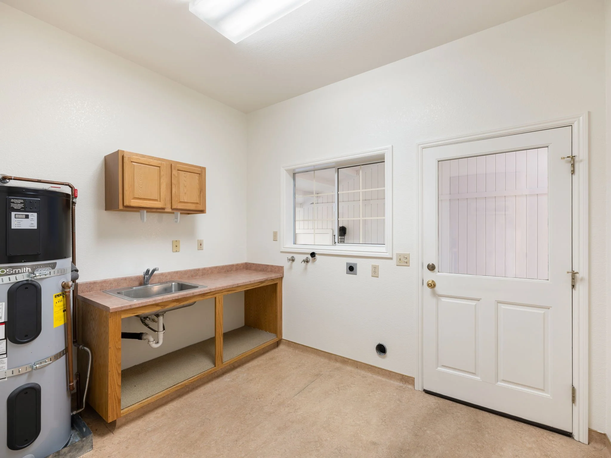 Empty laundry or utility room with sink, wooden cabinets, and hookups for a washer and dryer, featuring a window and a door leading outside. View fullsize