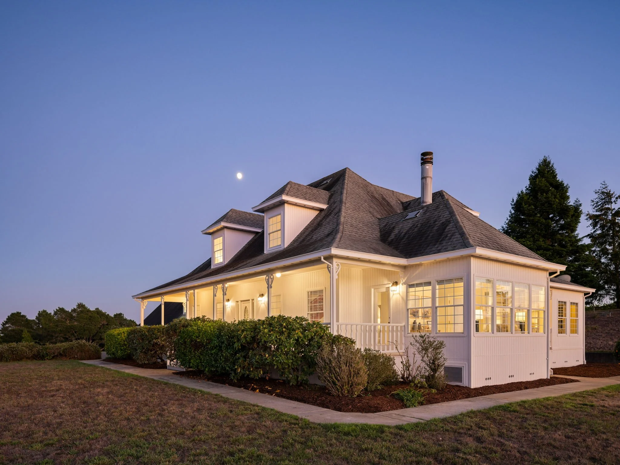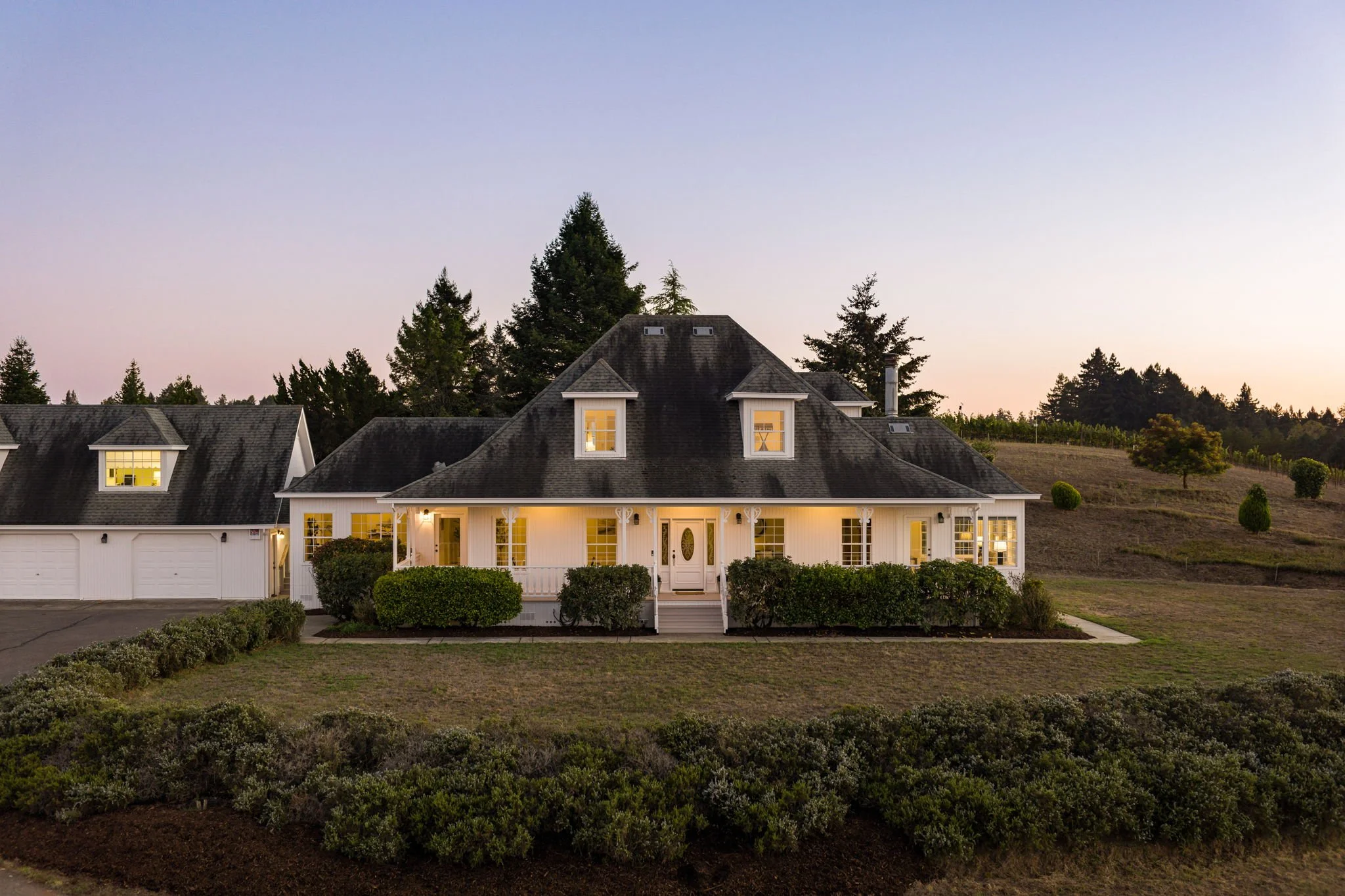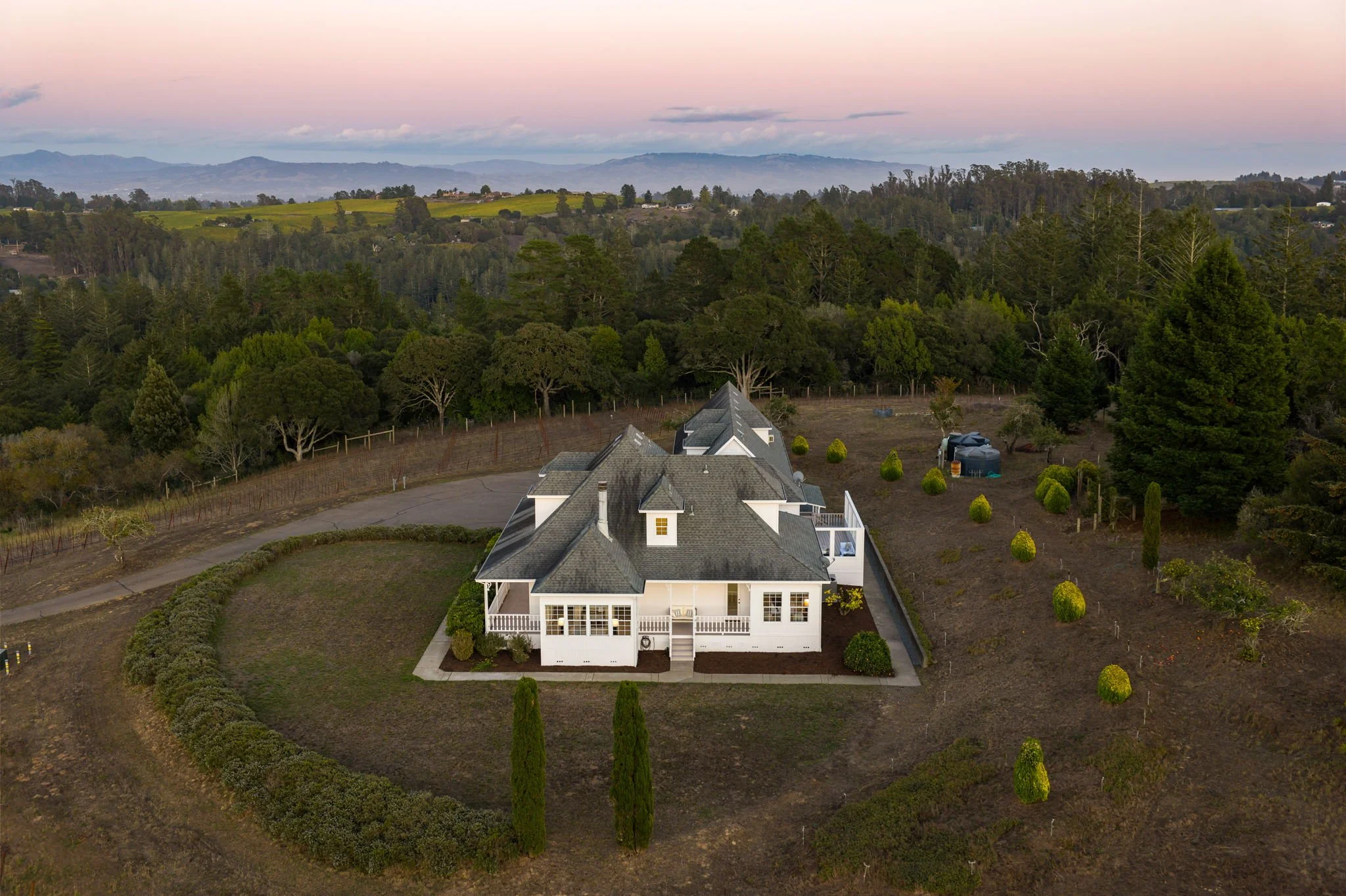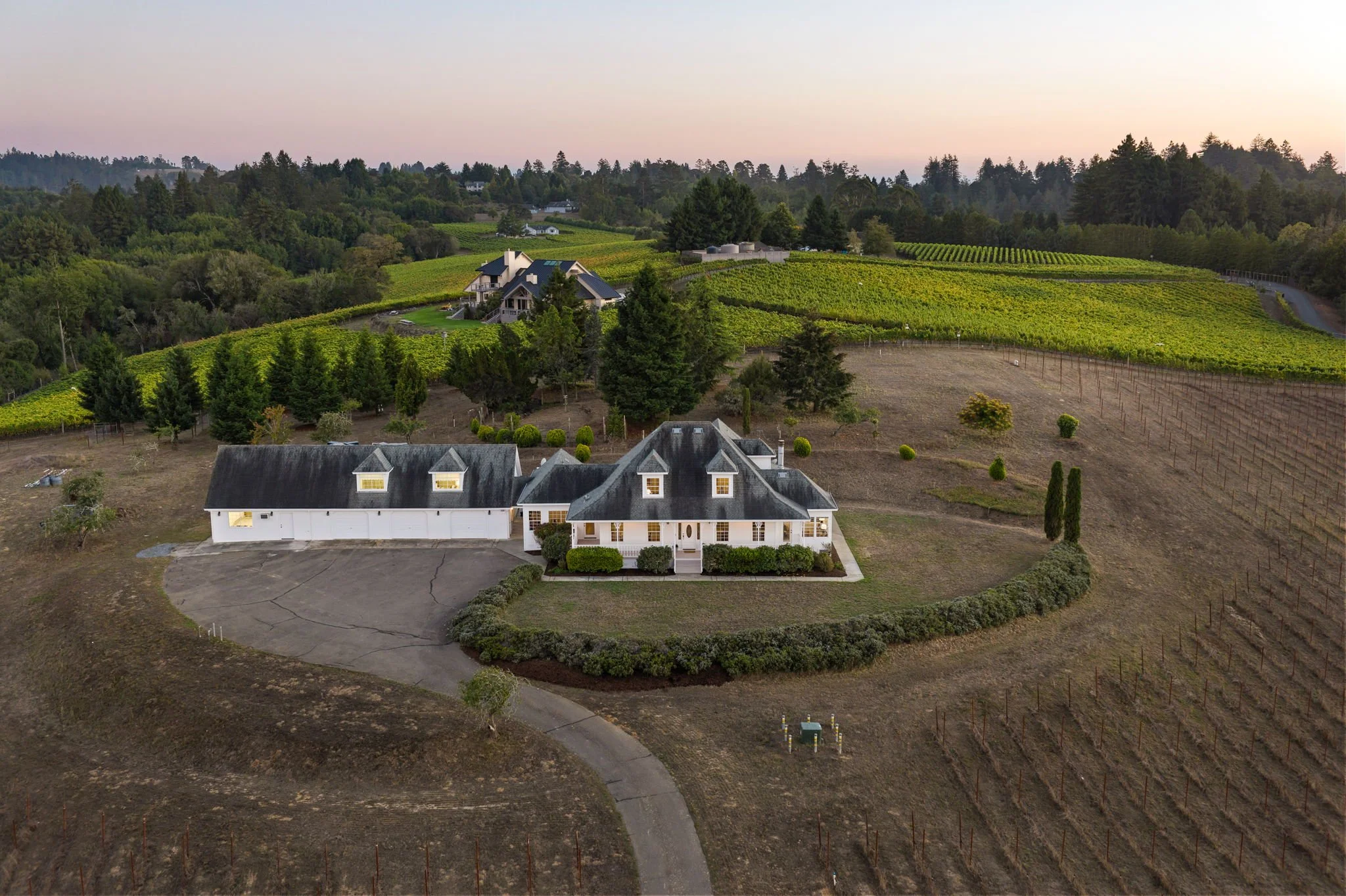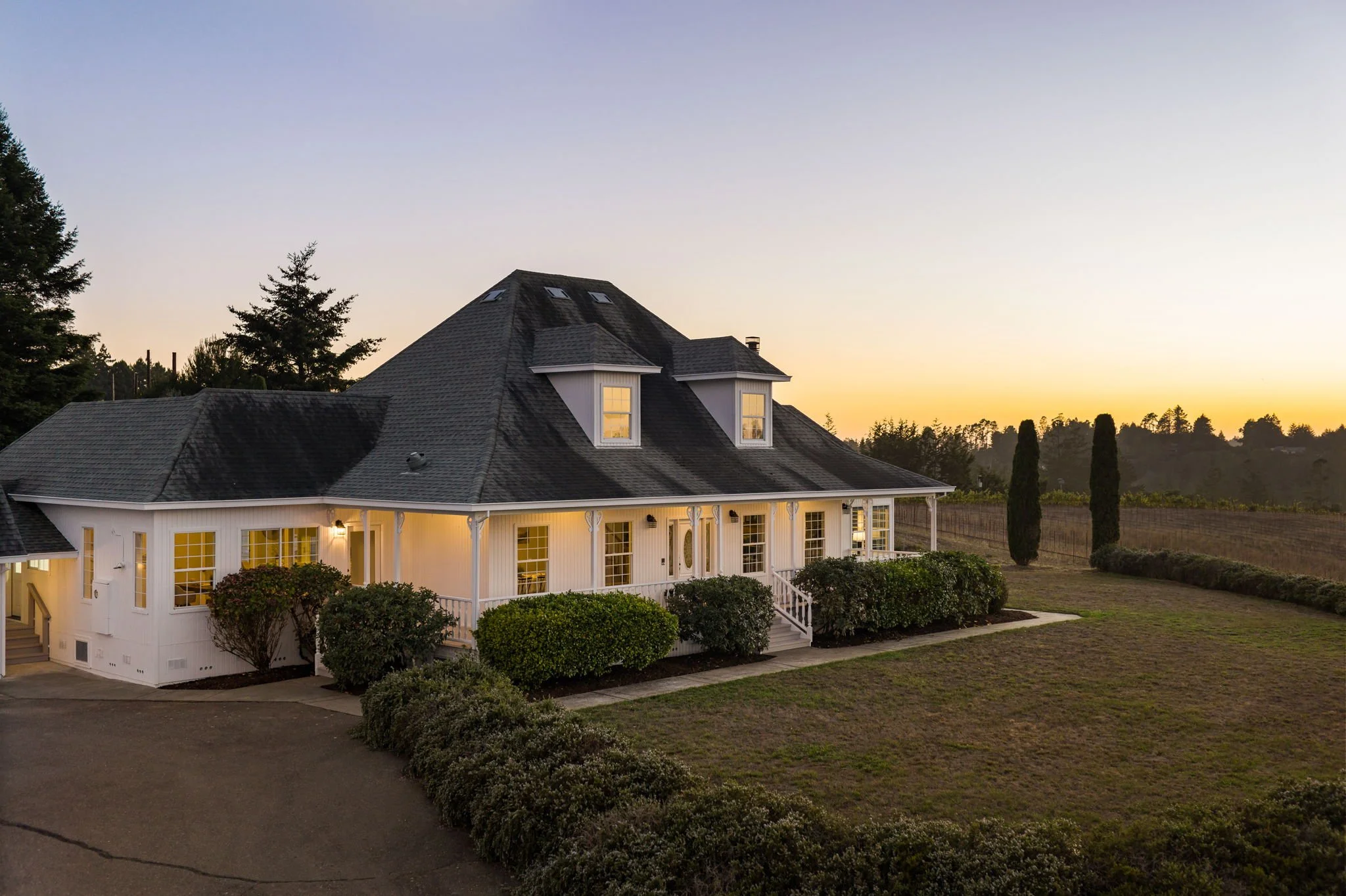 A large white house with a dark roof and a long driveway, surrounded by dry grass, with rolling green hills and vineyards in the background during dusk.