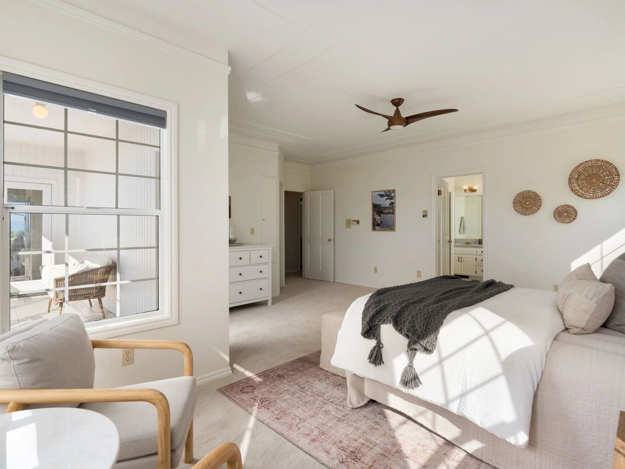 A bright, airy bedroom with white walls, a large window, and a bed with a gray blanket. There is a beige armchair with wooden arms, a pink area rug, and decorative wicker wall hangings. A ceiling fan is visible, and an open door reveals a bathroom wi View fullsize