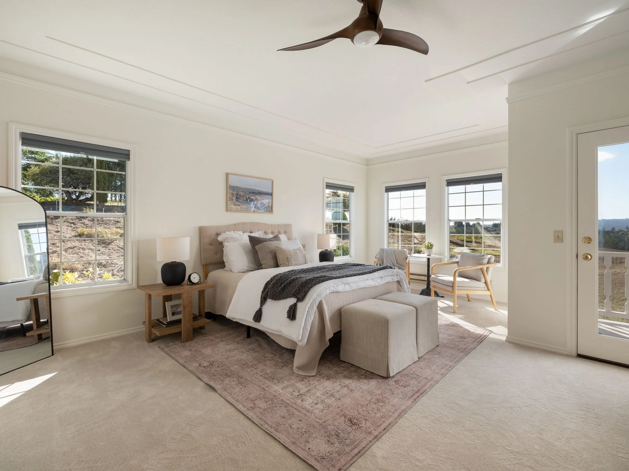 Bright bedroom with large windows, white walls, a bed with beige and brown pillows, gray blanket, white side chairs near windows, white dresser with decorative items, and a door leading outside. View fullsize