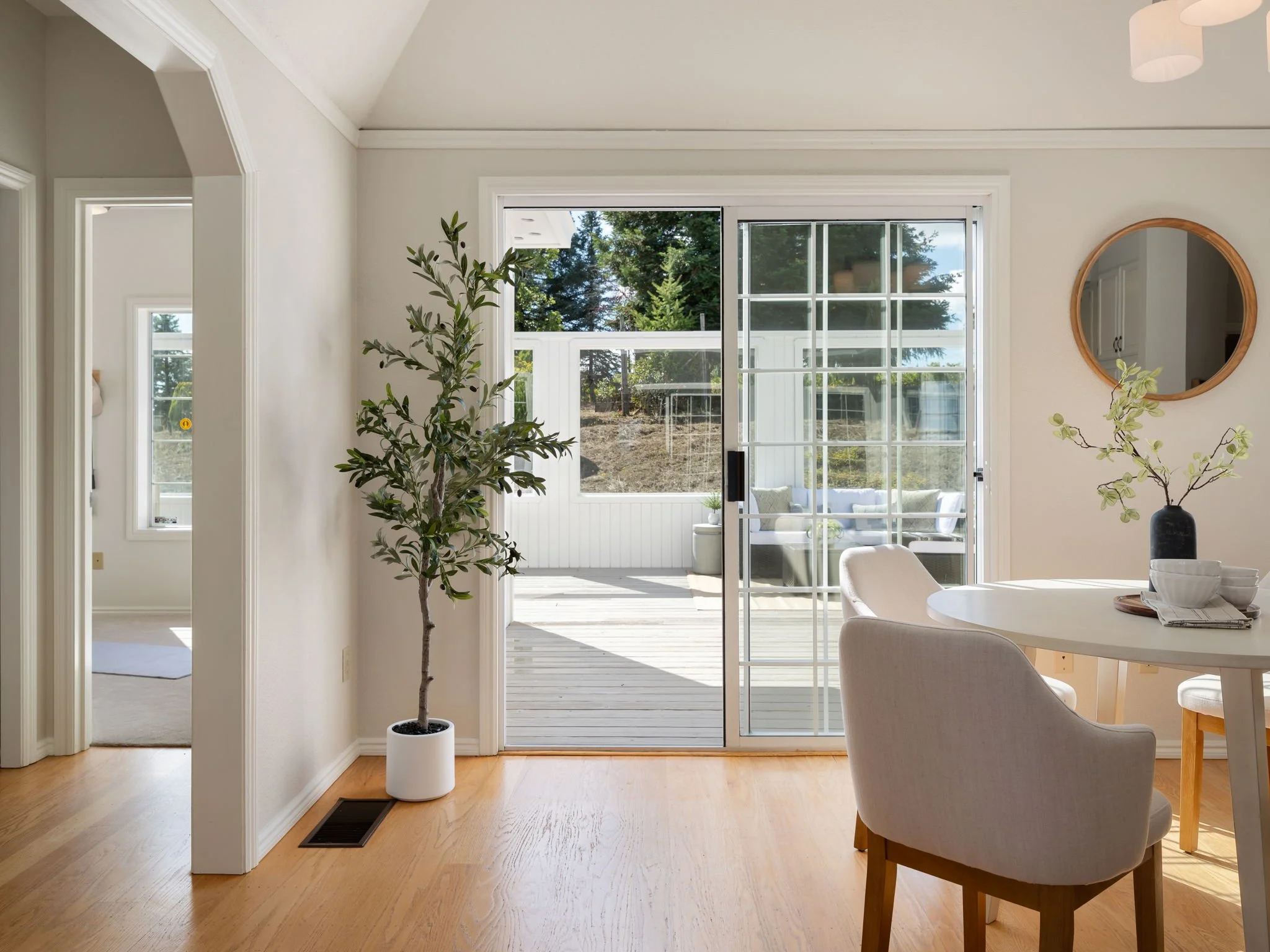 Bright dining area with a sliding glass door leading to an outdoor patio, a round table with a flower vase, and a large potted plant near the door.