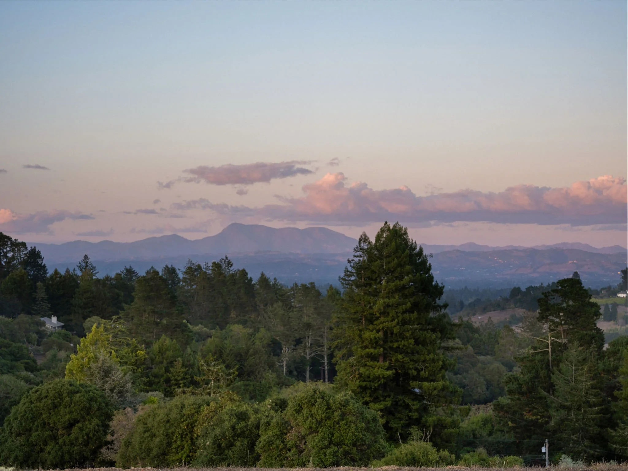 Large white house with a gray roof situated amidst green trees and rolling hills during sunset with mountains in the distance. View fullsize