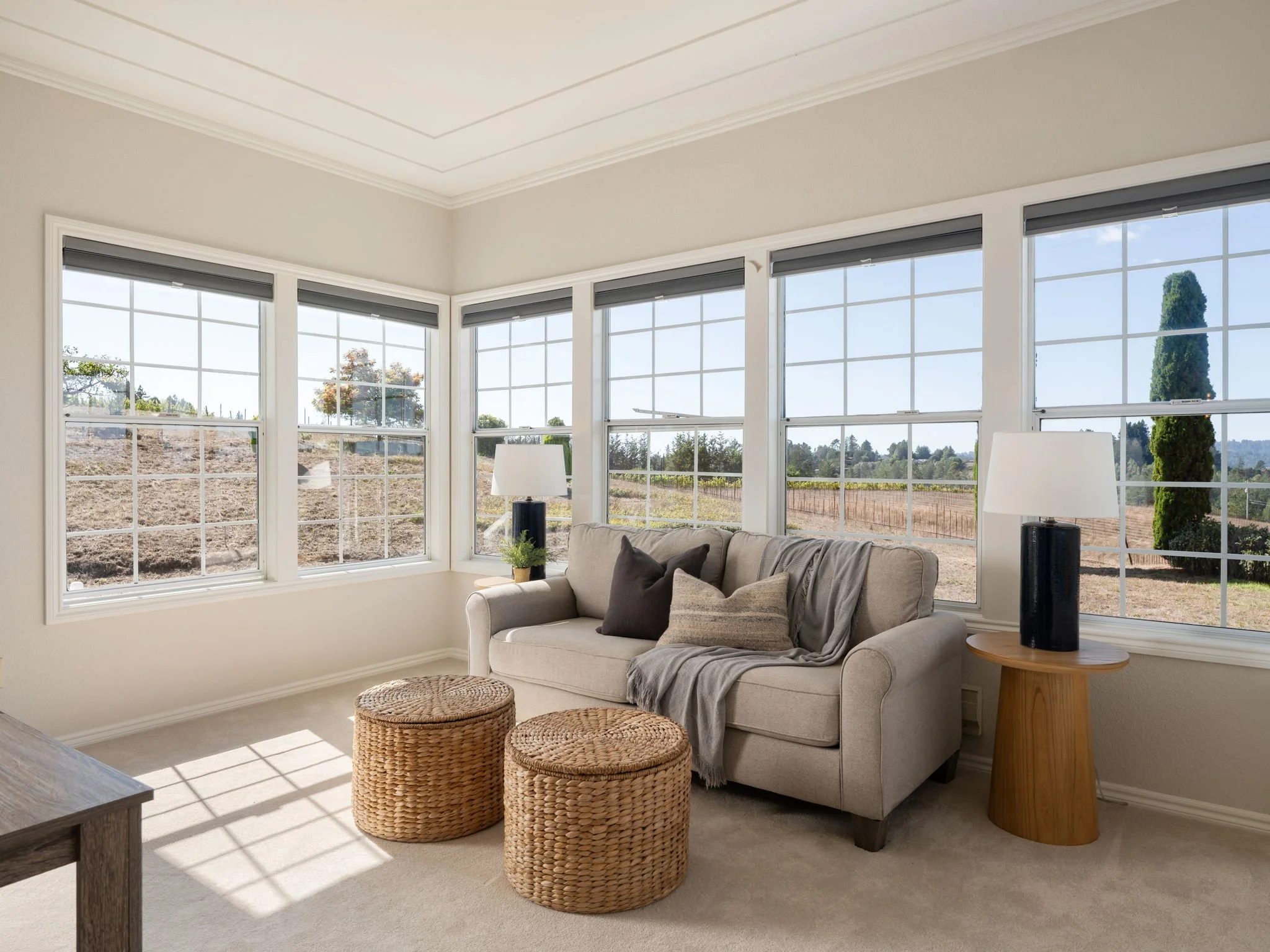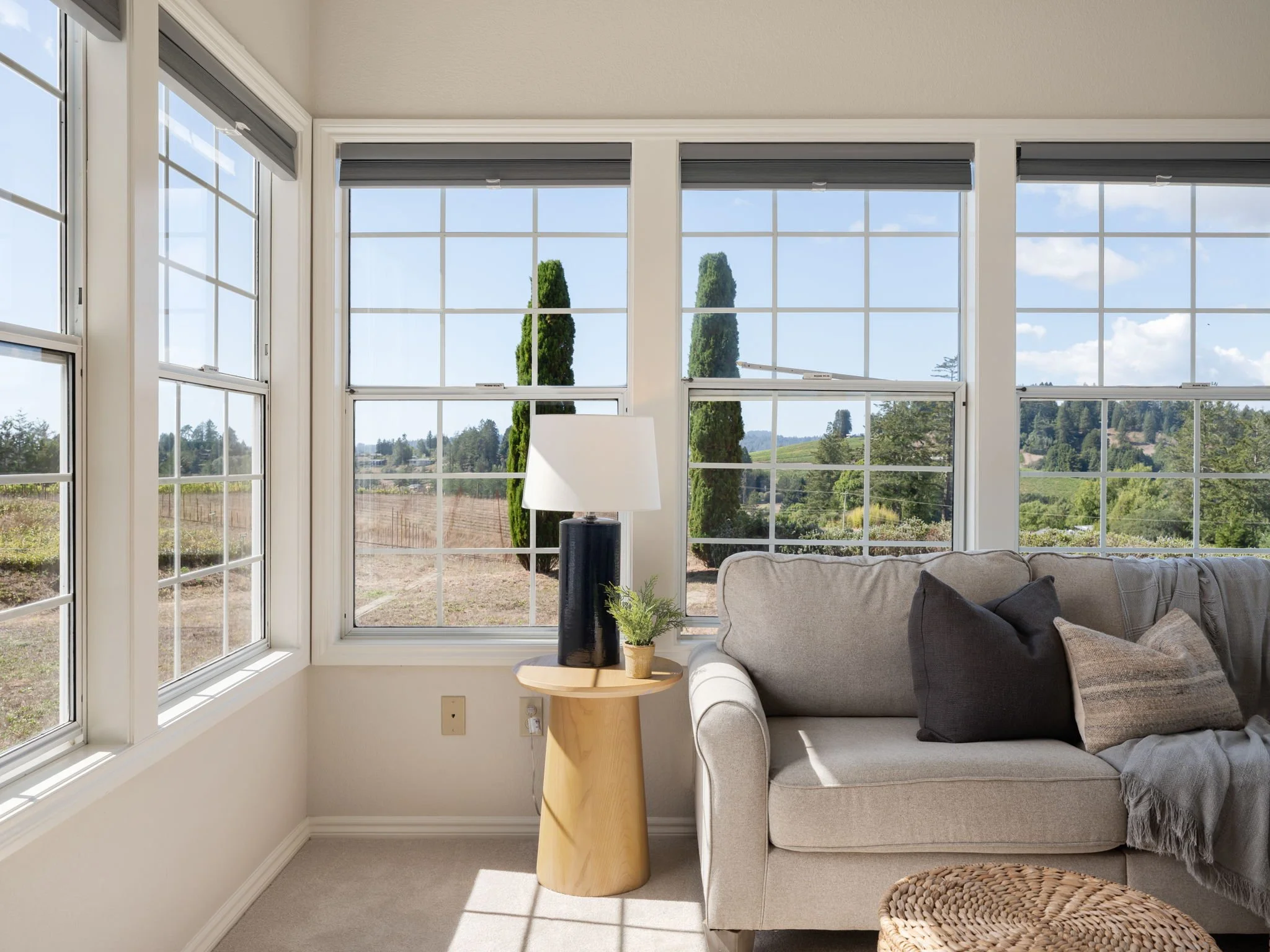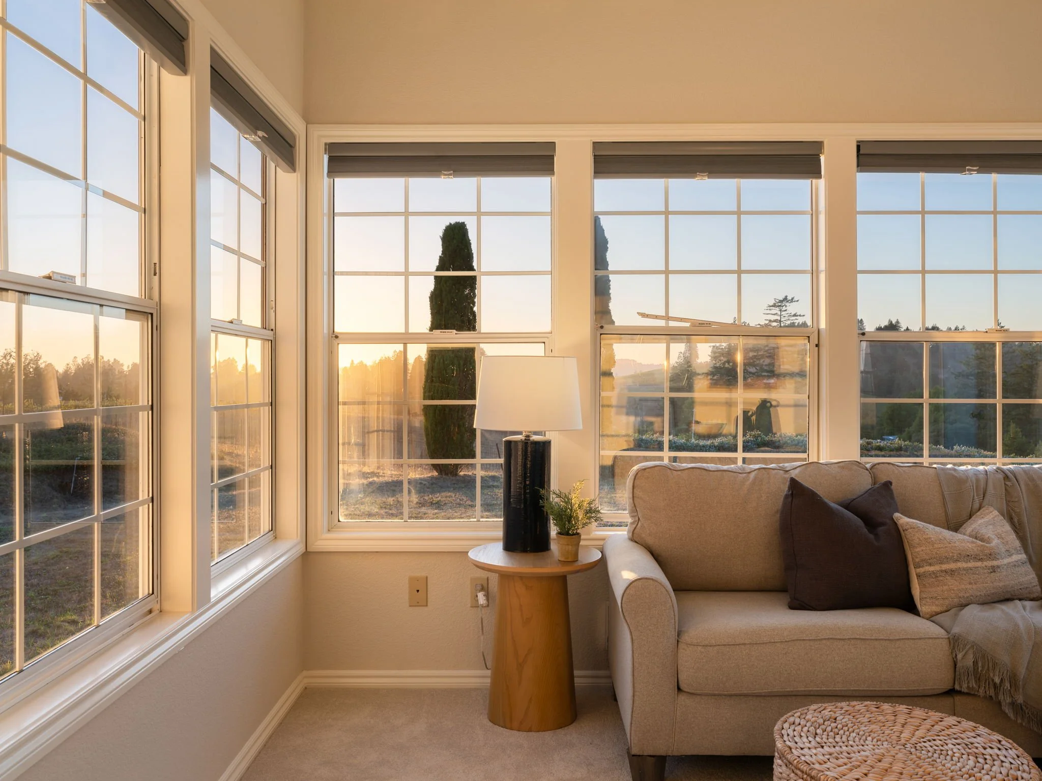Living room with large windows showing a scenic outdoor landscape, beige sofa with pillows, wicker ottomans, side table with a lamp and potted plant.