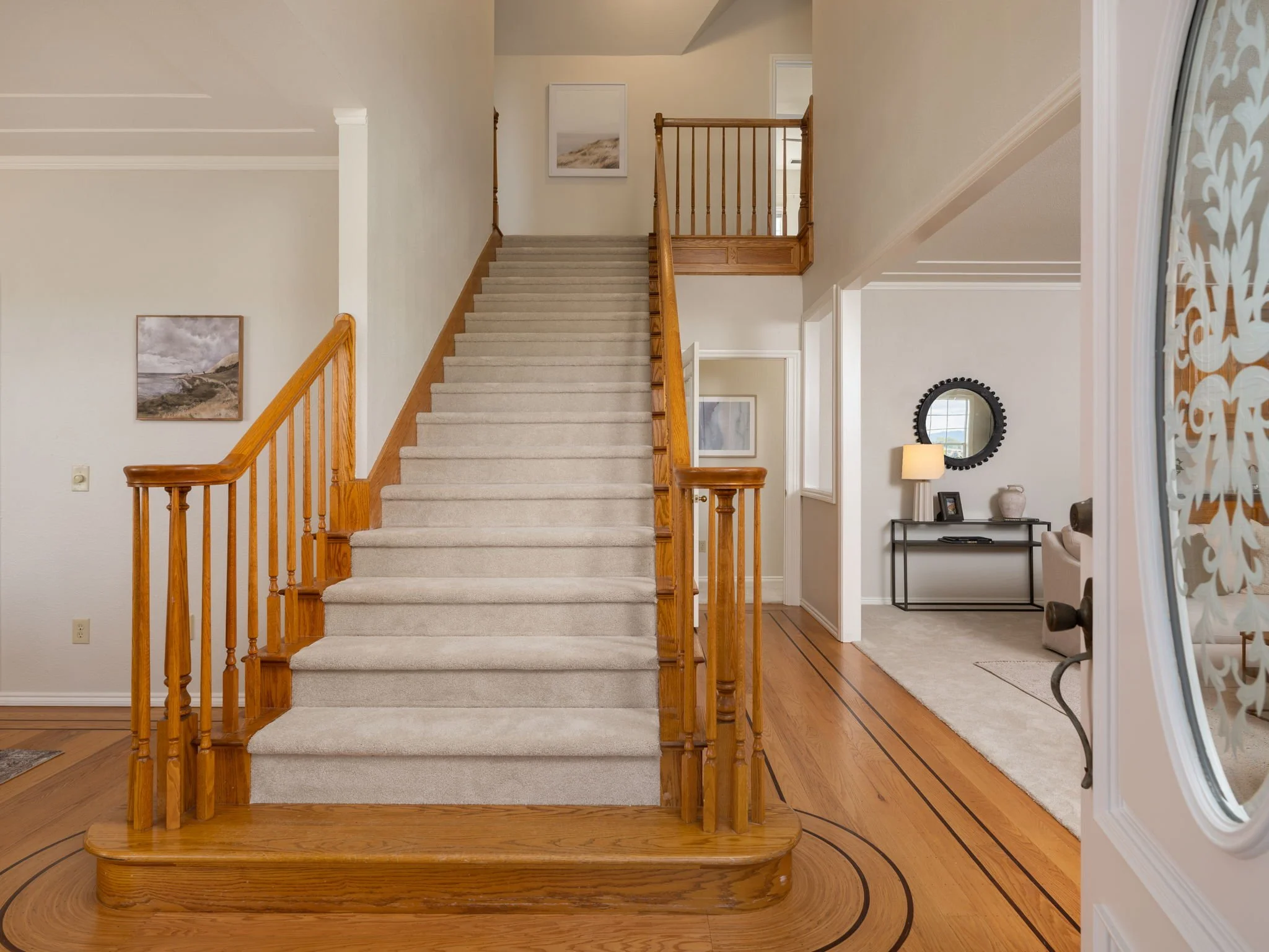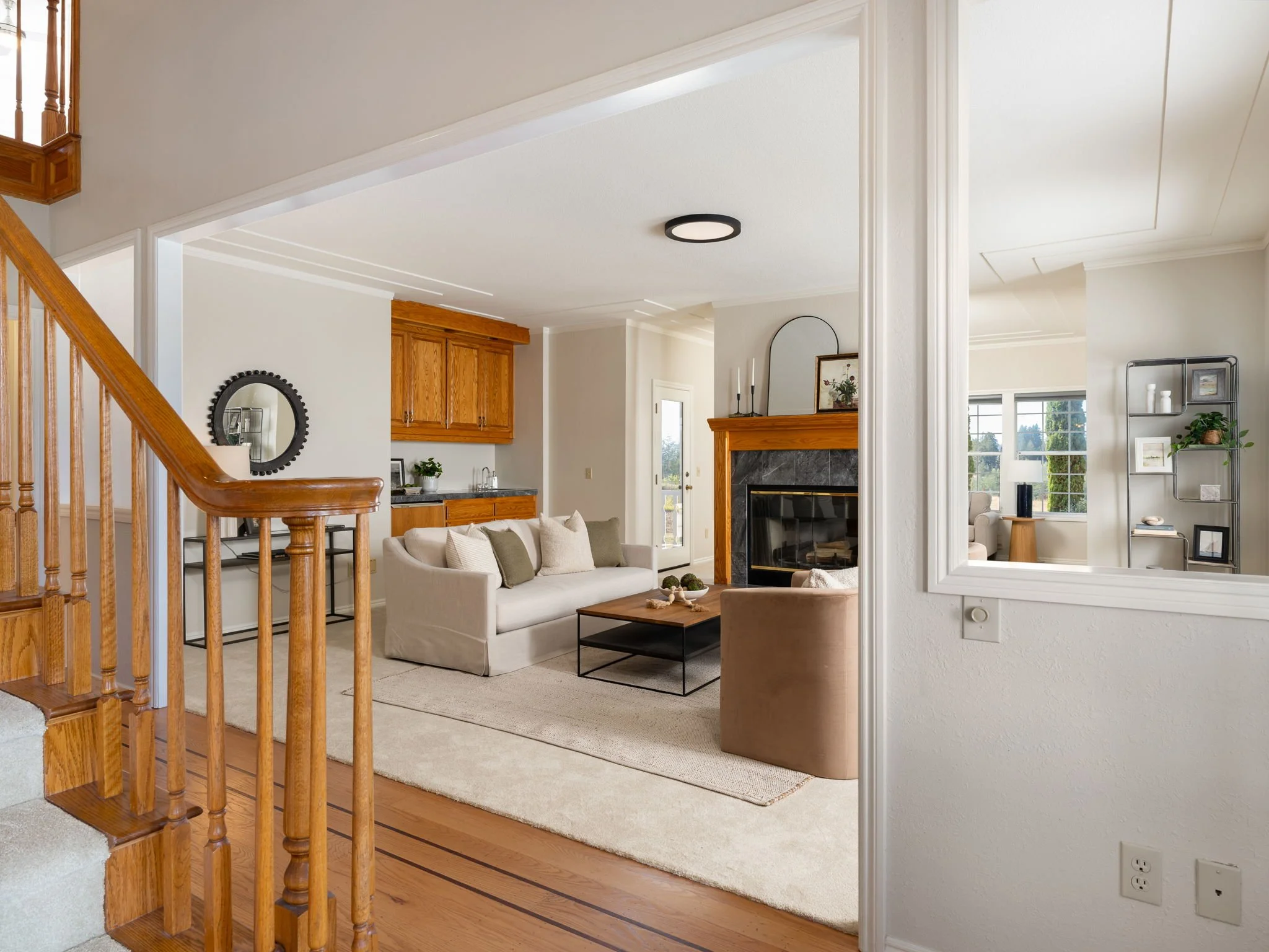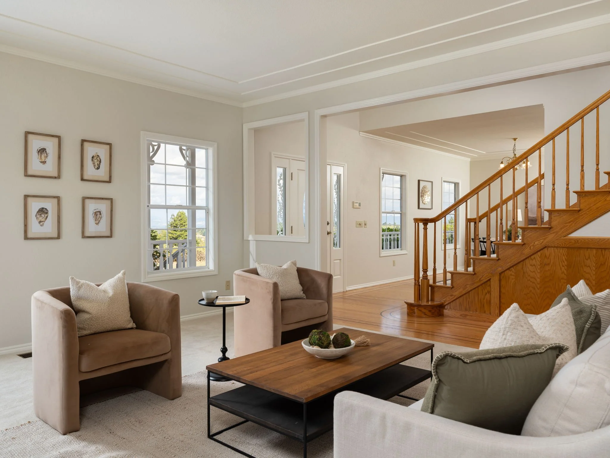 Living room with beige and gray furniture, framed artwork on the wall, windows with views of trees, wooden staircase, and hardwood flooring.