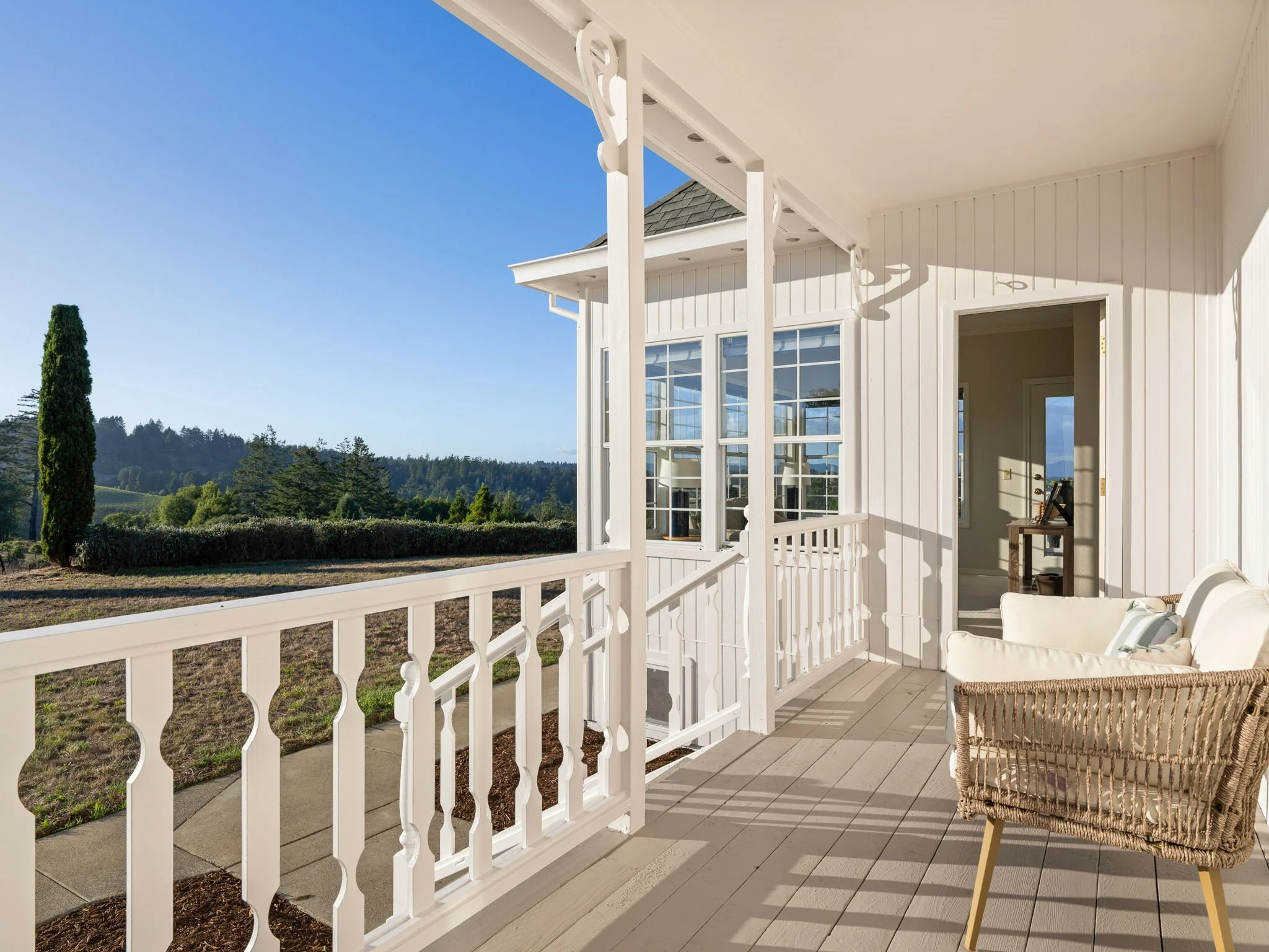 A porch with white railings and a wicker chair, overlooking a yard with a tree and distant hills under a clear blue sky. View fullsize