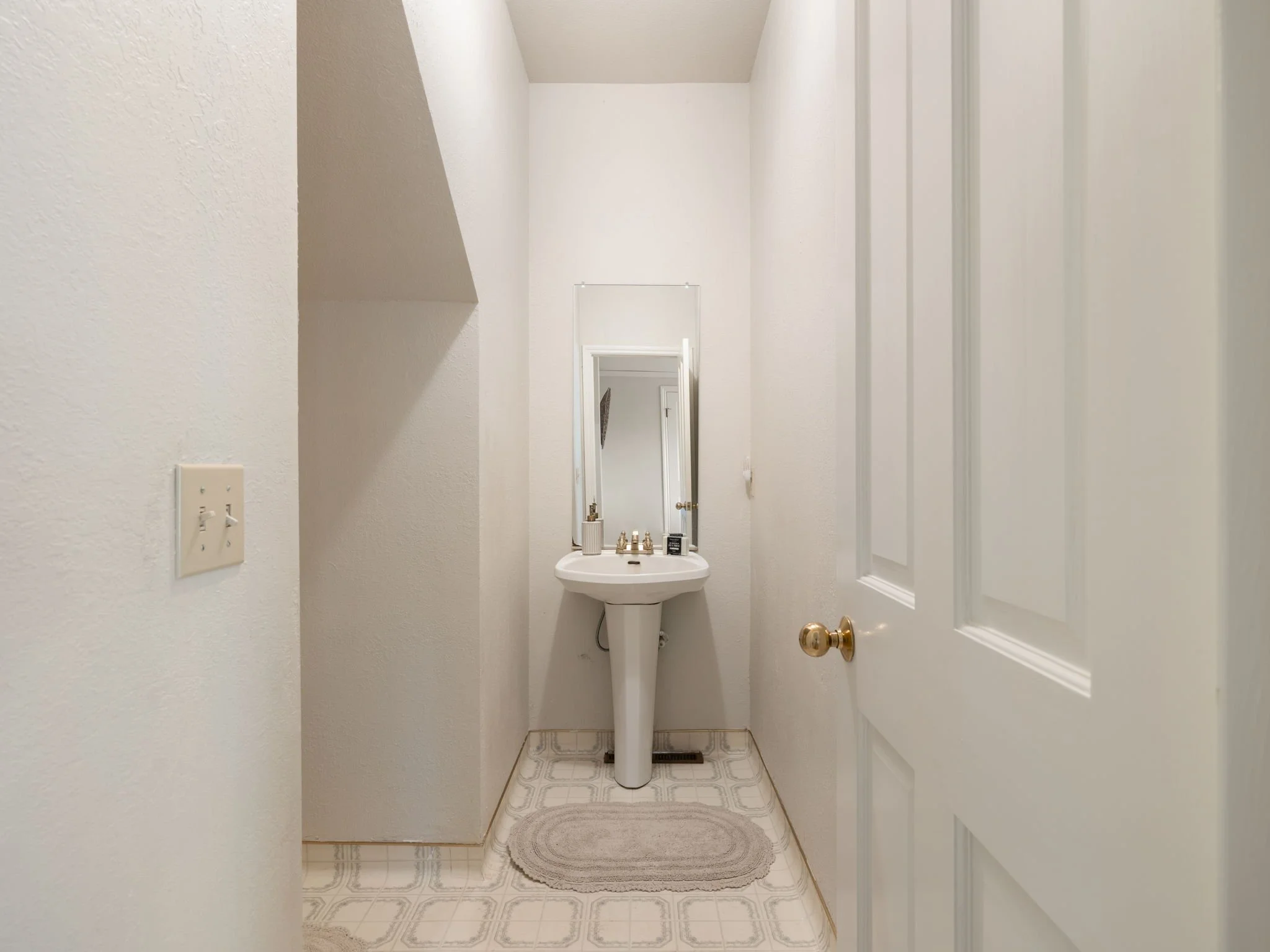 Small bathroom with a pedestal sink, mirror, and beige patterned floor. White walls and door, with ceiling height closet or wall opening on left. Small gray oval rug on floor.