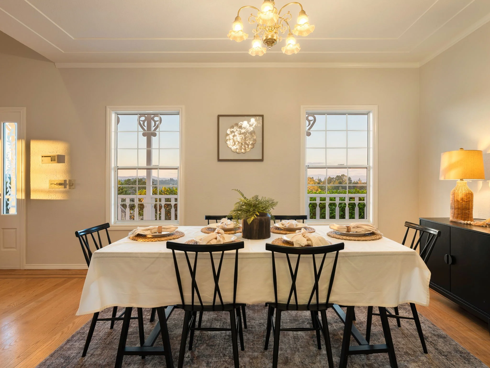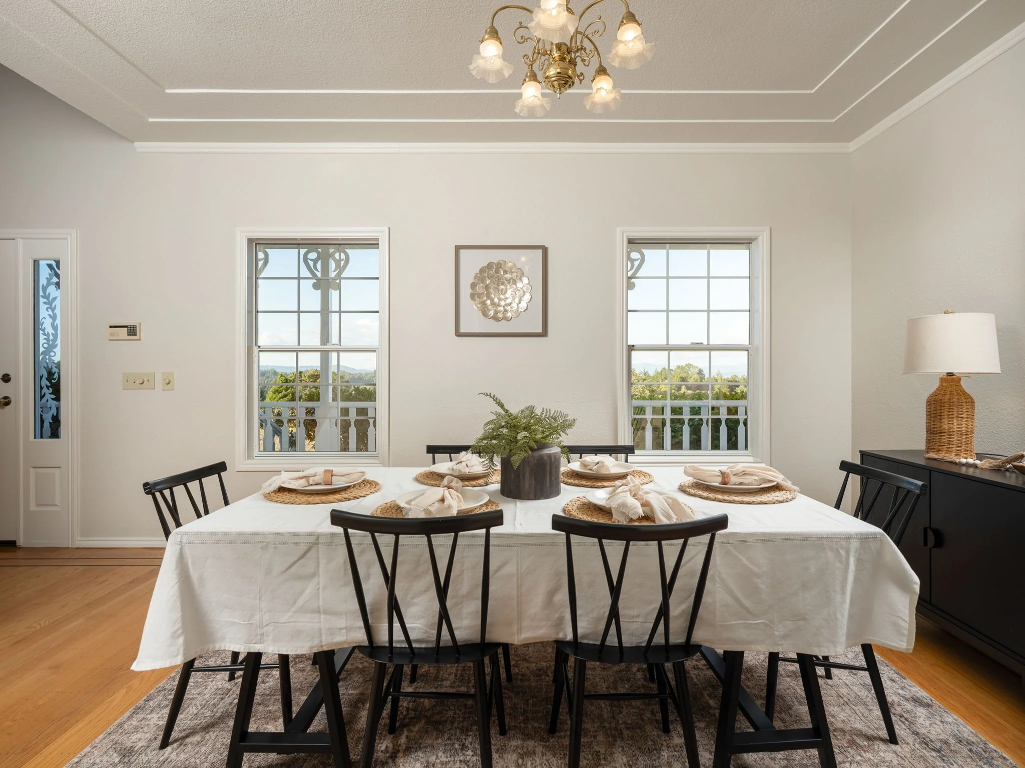 A dining room with a white tablecloth-covered table, six black chairs, and minimalist decor. There are two windows with a scenic view, a black sideboard with a lamp, a framed art piece, and a floral chandelier hanging from the ceiling.