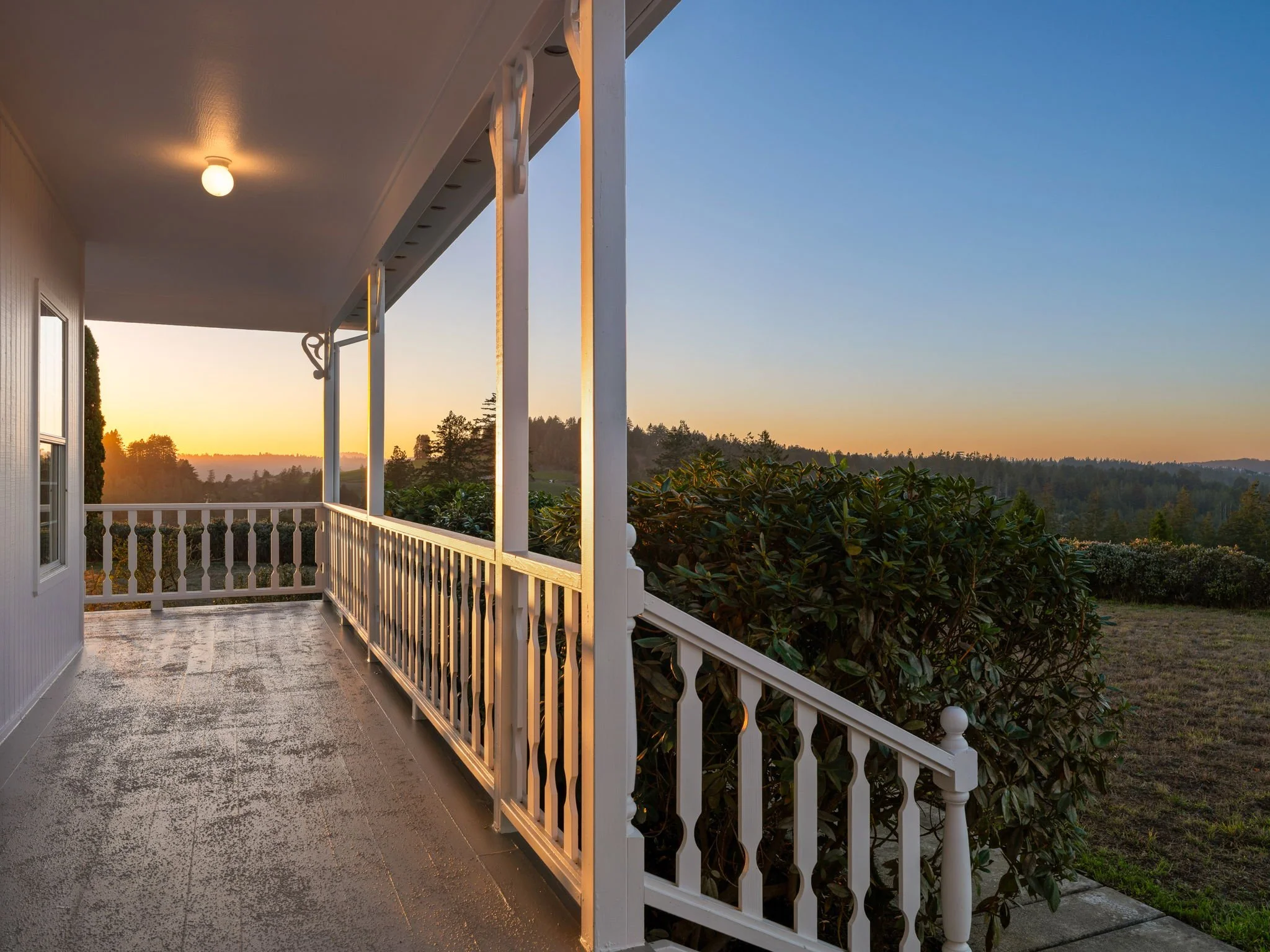 Front porch of a house during sunset with a white railing, a single light on the ceiling, and a scenic view of a tree-covered landscape in the distance. View fullsize