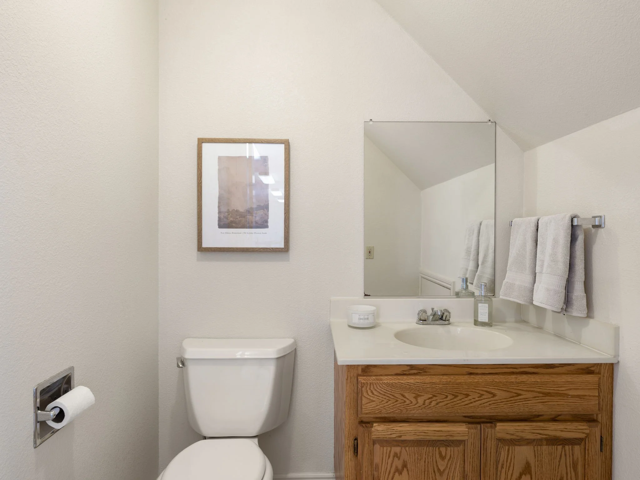 Bathroom with a toilet, a wooden vanity with a sink, a large mirror, a framed picture on the wall, and towel bars with folded towels.