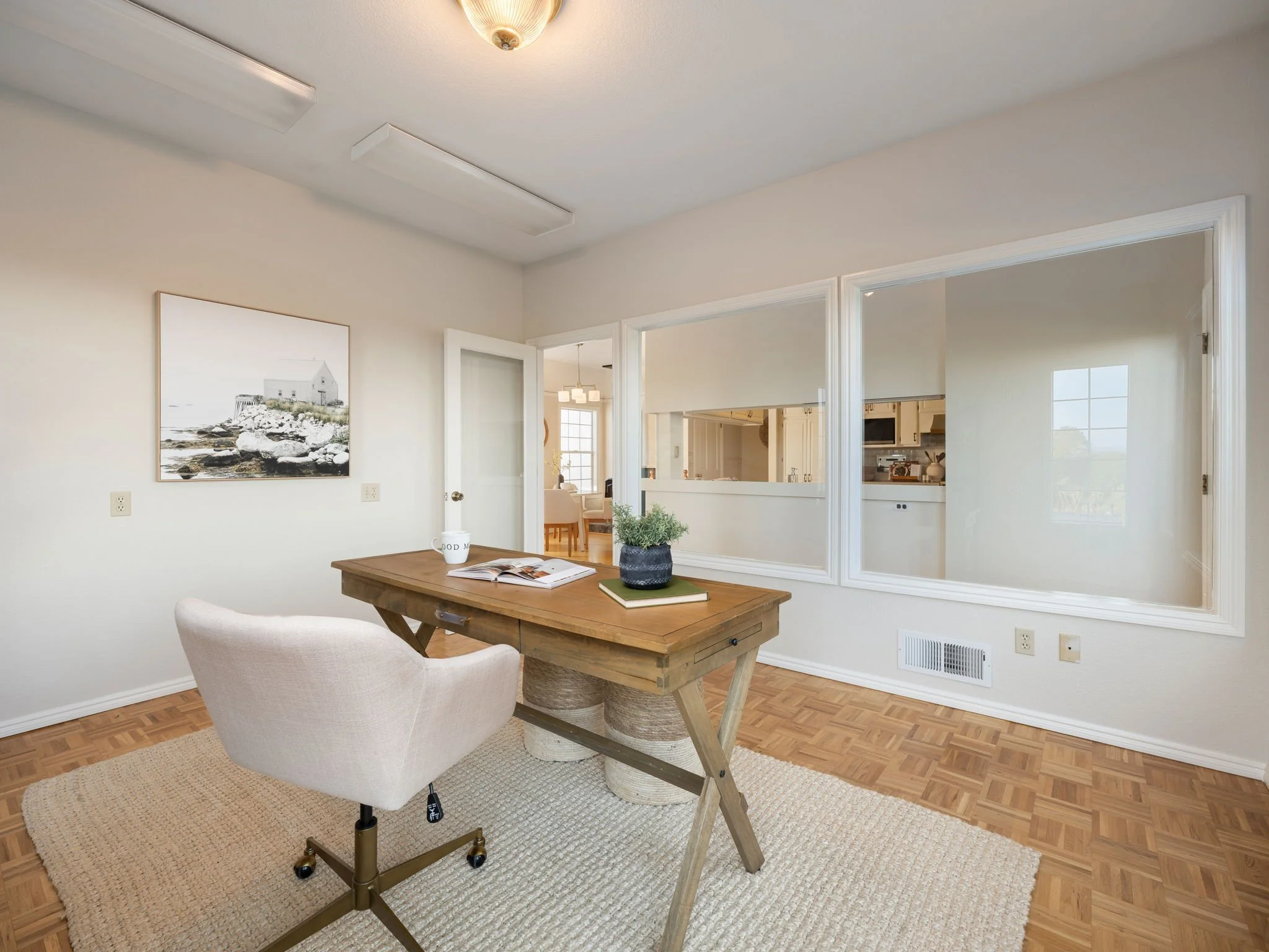 Home office with wooden desk, white swivel chair, a potted plant, open magazine, and coffee mug, with light-colored walls, wooden flooring, and large windows.