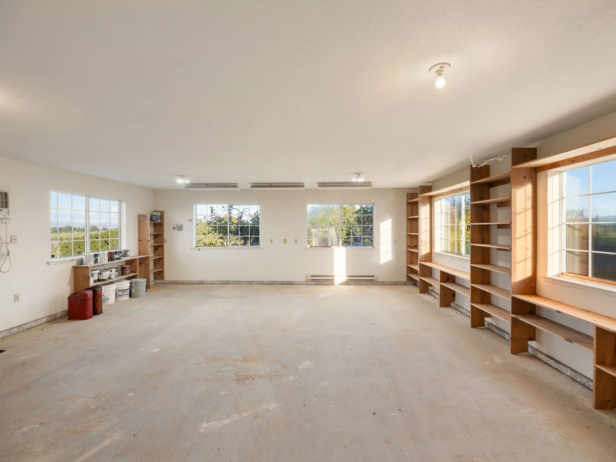 Empty room with large windows, wooden shelves along the walls, and construction materials on the floor. View fullsize