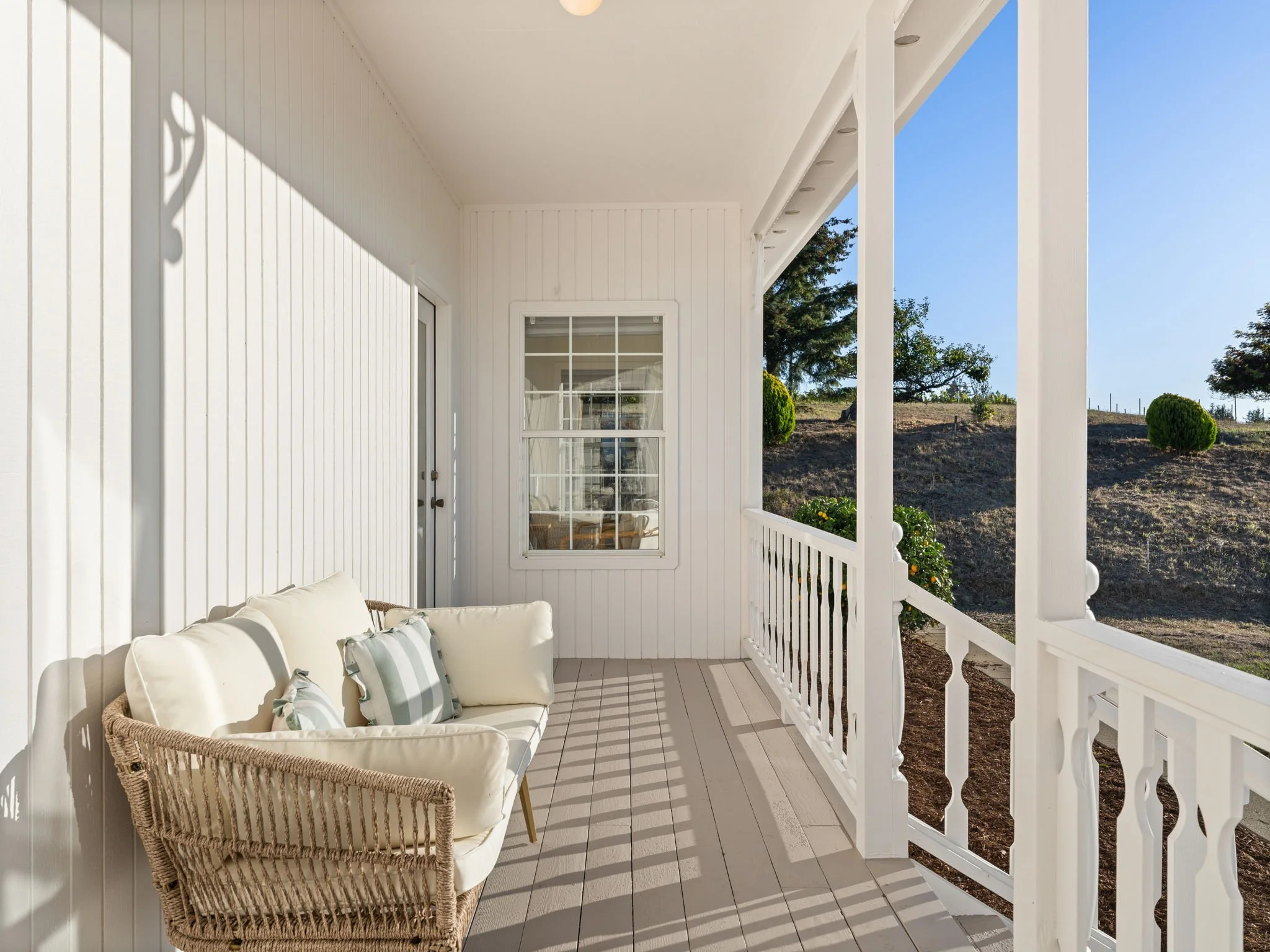 A porch with white railings and a wicker chair, overlooking a yard with a tree and distant hills under a clear blue sky.
