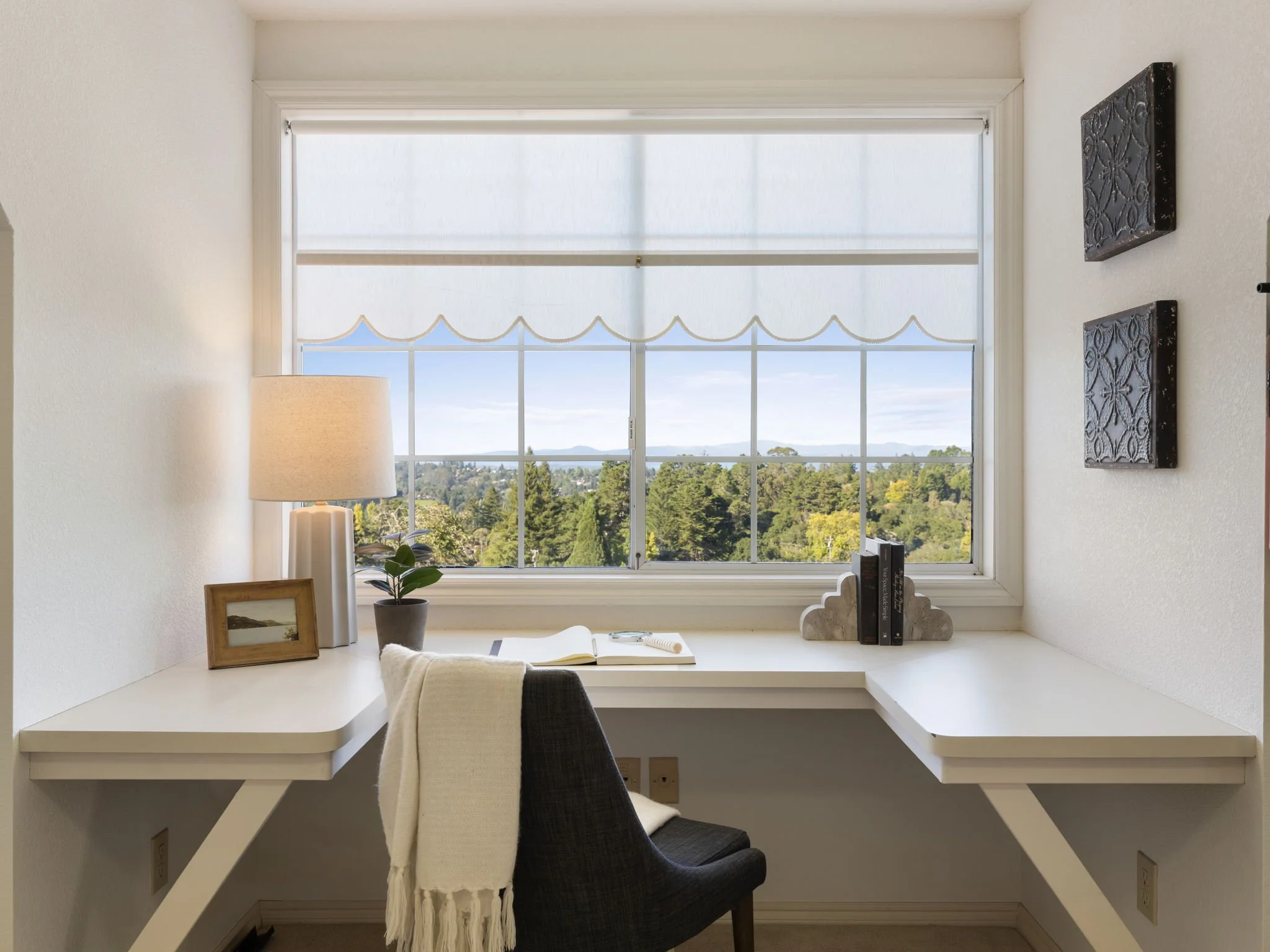 Home office desk area with a large window overlooking a landscape of trees and sky. The desk has a table lamp, a small potted plant, a picture frame, and books, with a black chair and cream throw blanket.