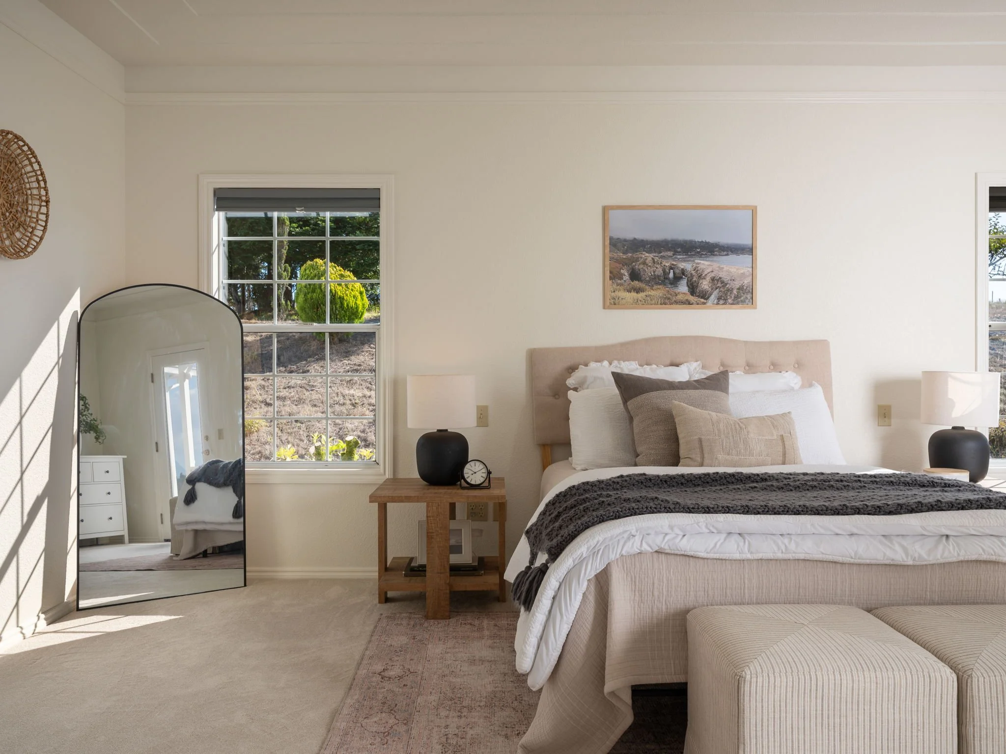 Bedroom with a large bed, beige headboard, pillows, two nightstands with lamps, a framed landscape photo, a mirror reflecting a chair, and two windows showing outdoor greenery.