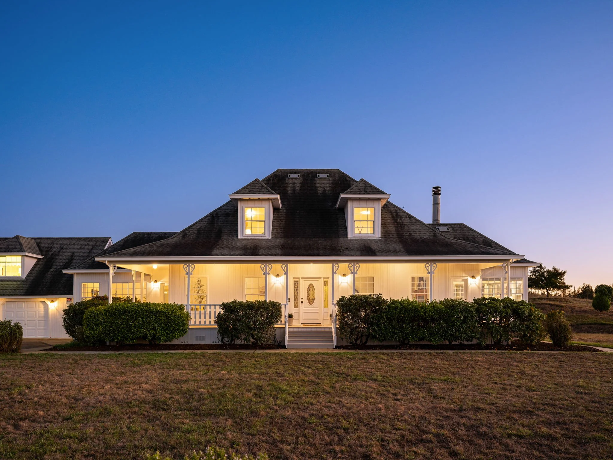 A two-story house with a wrap-around porch, lit from within, situated in a rural area during dusk or early evening. The sky is clear with a blue hue, and there are mountains or hills in the background.