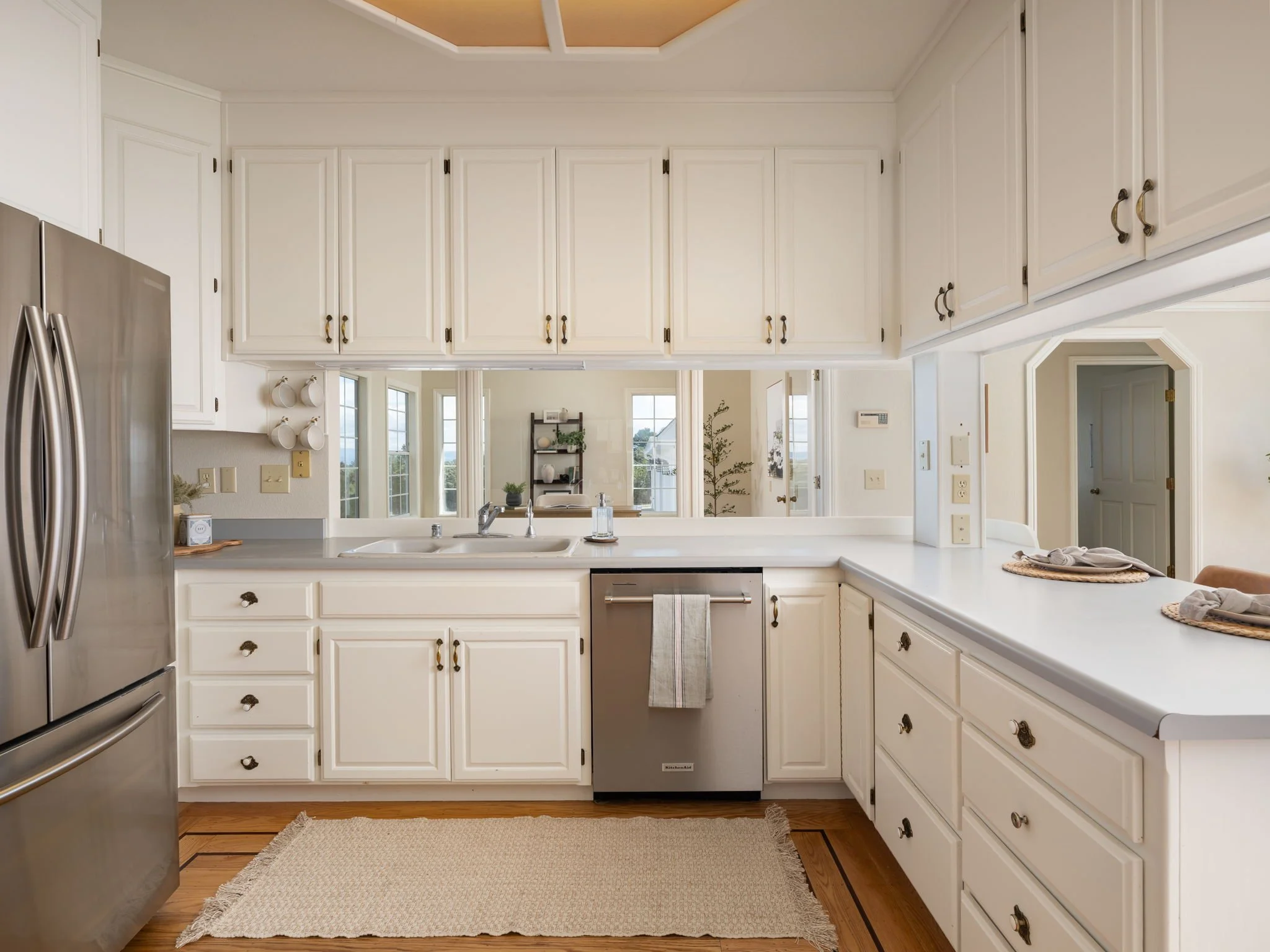 A kitchen with white cabinets, olive handles, a stainless steel refrigerator, and small window across the back wall. Includes a sink, dishwasher, countertop, and windows in the background.