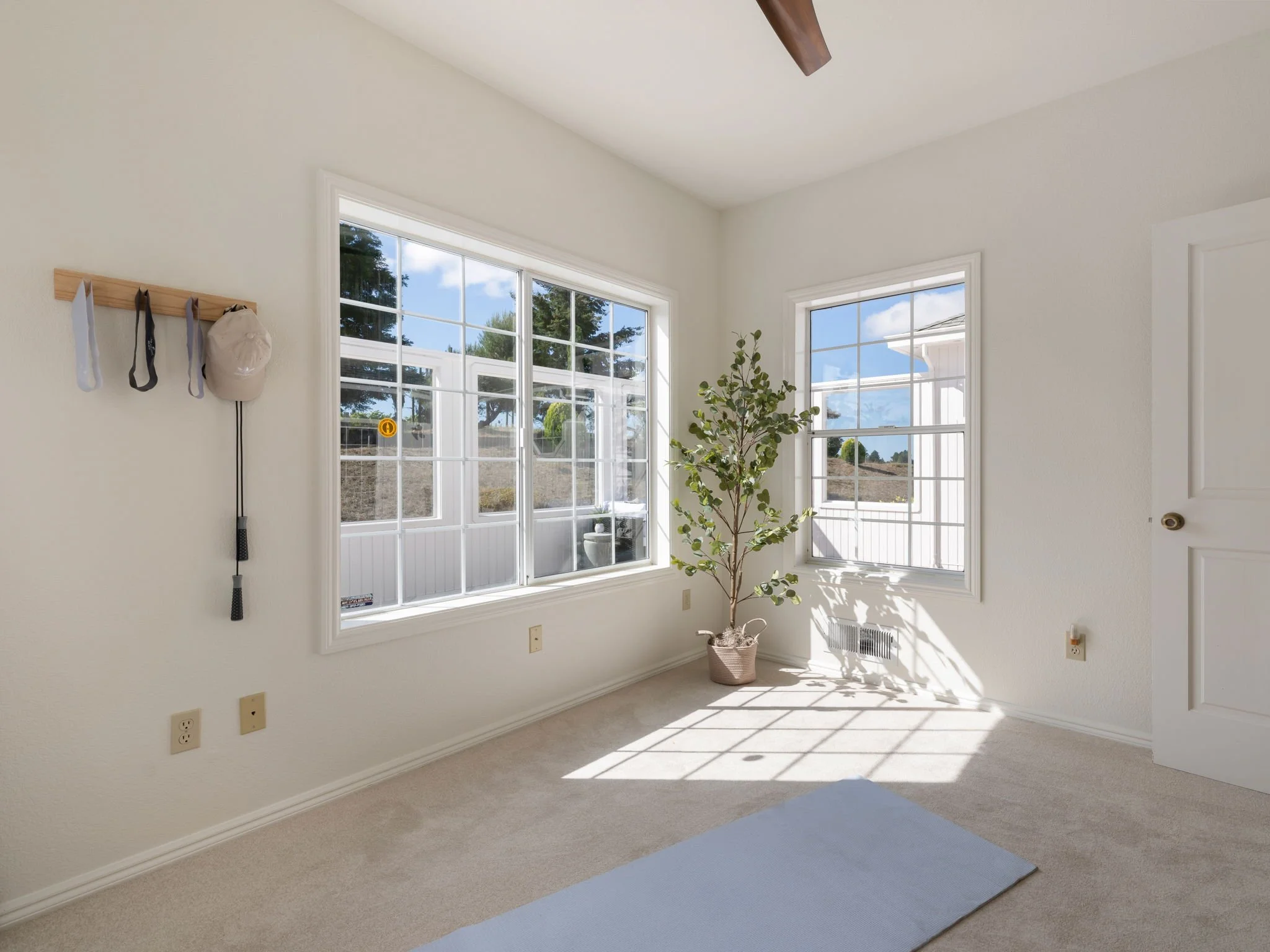A bright, empty room with large windows, a potted plant, a wall hook with hanging items, and a yoga mat on the beige carpet floor. View fullsize