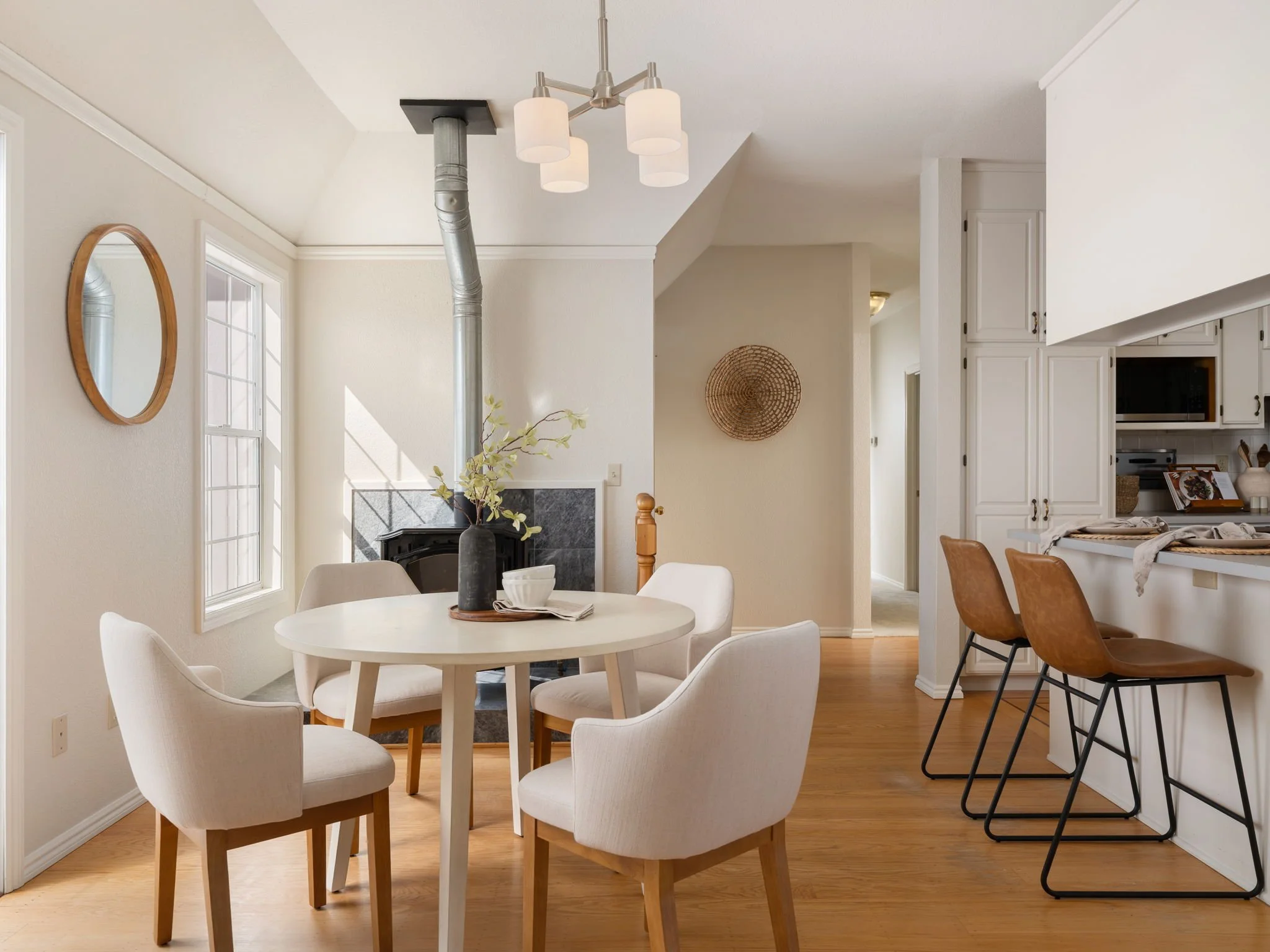 Dining area with a round table, four white upholstered chairs, a black vase with branches, and a fireplace. Adjacent kitchen with three brown barstools at a counter.
