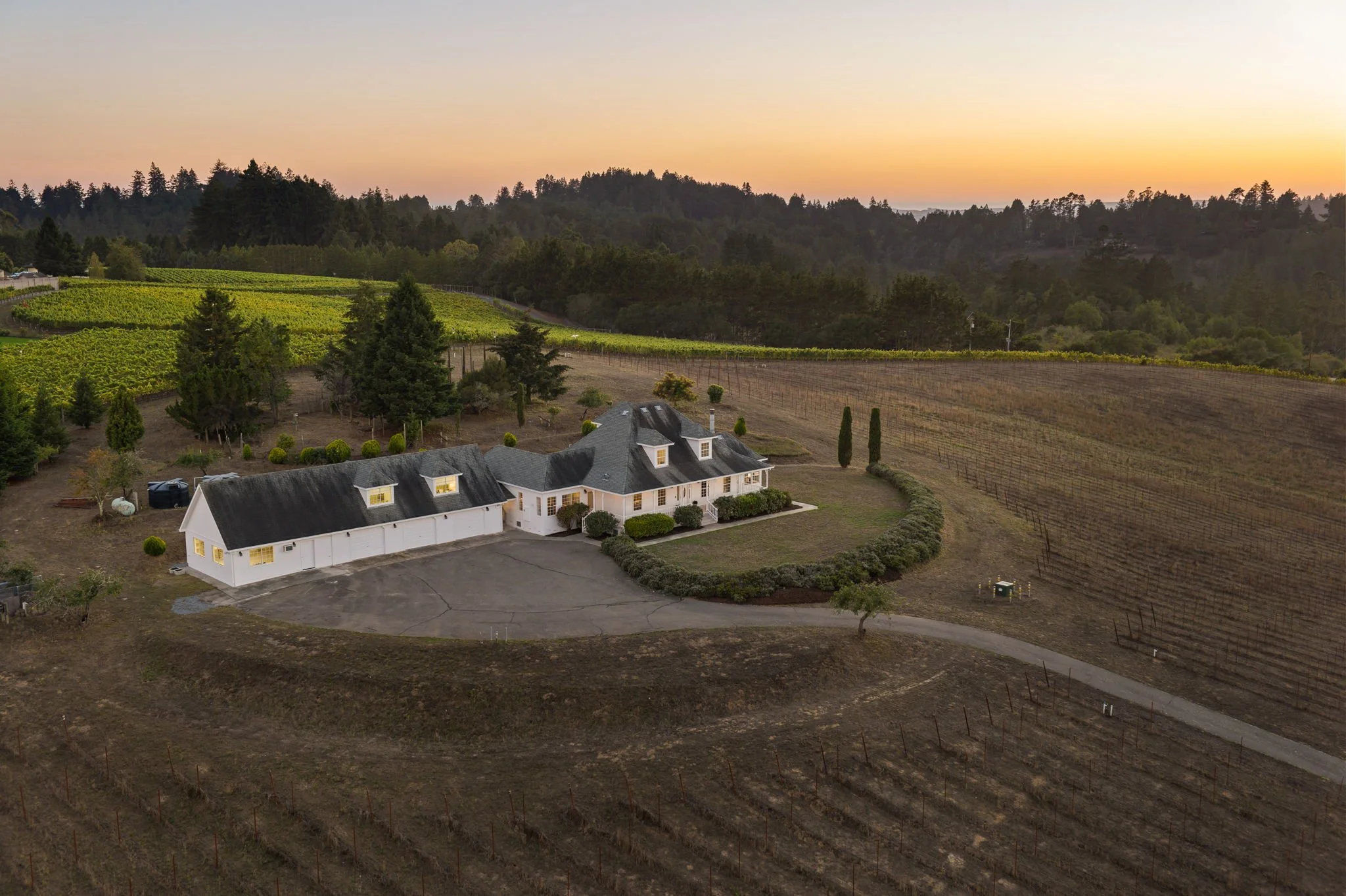 A rural estate with a large white house, guest house, and surrounding landscape of vineyards, trees, and hills under a clear sky at sunset. View fullsize